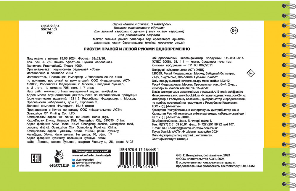 💳 Оплатить за товар можно при получении 🇰🇿 Есть бесплатная доставка по Казахстану от 1 дня 🎁 Копите бонусы с каждой покупки Серия: Пиши и стирай. С маркером «Рисуем правой и левой руками одновременно» — удобный и полезный многоразовый рабочий блокнот, в котором можно писать, рисовать и стирать хоть 100 раз! Плотная мелованная бумага и глянцевые ламинированные страницы делают книгу не только привлекательной, но и долговечной. В комплекте — 2 маркера на водной основе. В книге собраны занимательные задания, цель которых — наладить согласованное взаимодействие правого и левого полушарий мозга, благодаря чему ребёнок станет более внимательным и усидчивым, улучшит свою память, речь, мелкую моторику и координацию движений. Книгу можно использовать дома, на занятиях в детском саду и даже в дороге. Для дошкольного возраста. |