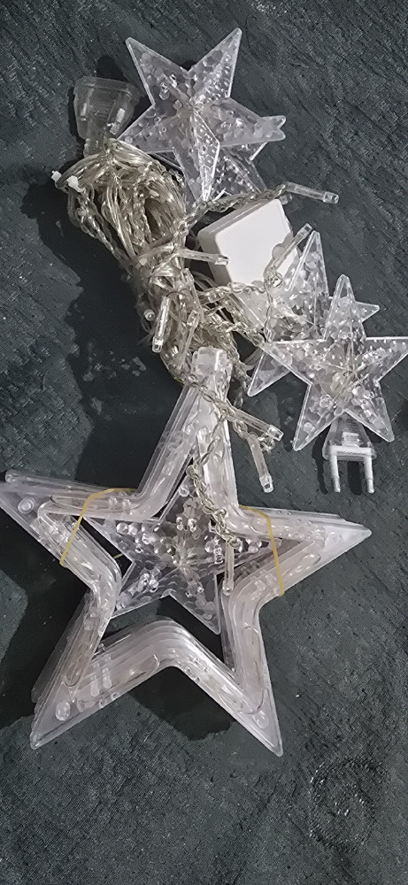 Отличные ночные звёзды!!! Окна преобразились! В тёмное время суток , фантастическое мерцание! И ещё , из плюсов , звёздные гирлянды можно соединять между собой , если расстояние между окнами не слишком большое . С одной стороны , маленькая вилочка , а с другой крошечная розетка! Имеет несколько режимов свечения , маленьким переходником с кнопочкой можно регулировать! Сколько режимов , не скажу , повесила только сейчас... И ...Смотрится супер! Огромное , спасибо! С наступающим Новым Годом! Вы лучшие! Успехов и процветания вам и вашей компании!