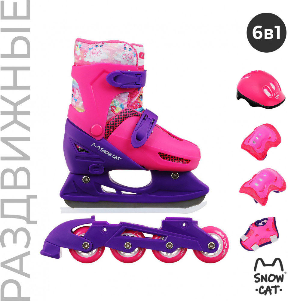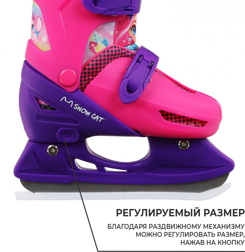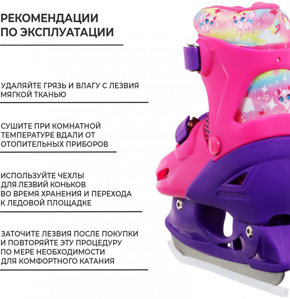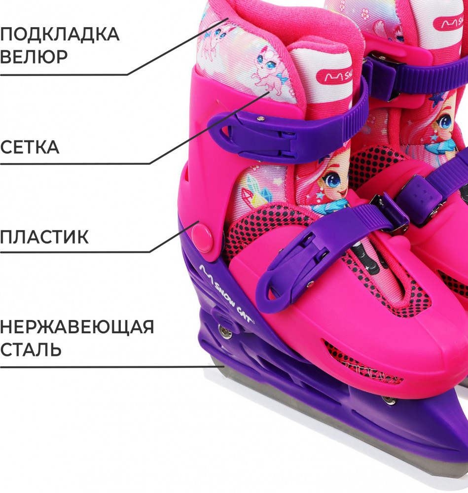 Коньки подходят для катания на открытом льду и крытых катках. Их легко надеть, отрегулировать и зафиксировать с помощью пластиковых клипс, которые расположены на голенище и в области ступни. Благодаря заменяемым ледовой и роликовой платформам можно кататься зимой и летом. Жёсткий корпус защищает ногу от травм, гарантирует плотную посадку и поддерживает голеностоп. Внутренняя подкладка из сетки и бархата согревает и создаёт комфорт. Коньки регулируются на 4 размера, это позволяет использовать их в течение нескольких сезонов. Для изменения размера необходимо зажать кнопку Push у основания пятки и раздвинуть две части пластикового каркаса до нужного положения. Внутренний сапожок состоит из двух частей, которые фиксируются c помощью липучек. При изменении размера его необходимо достать и закрепить в нужном положении. Универсальное лезвие из нержавеющей стали не поддаётся коррозии.