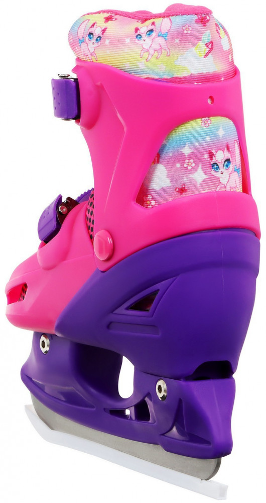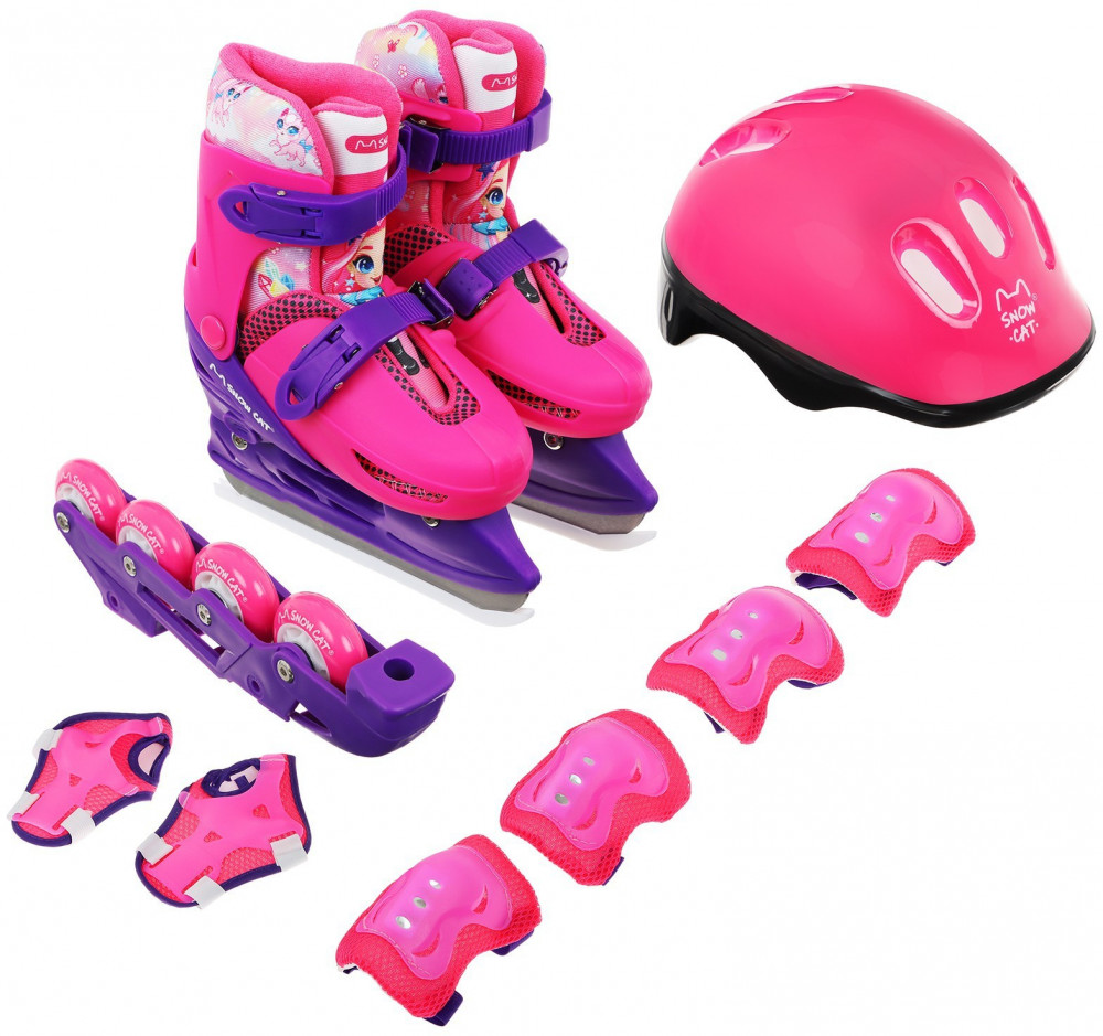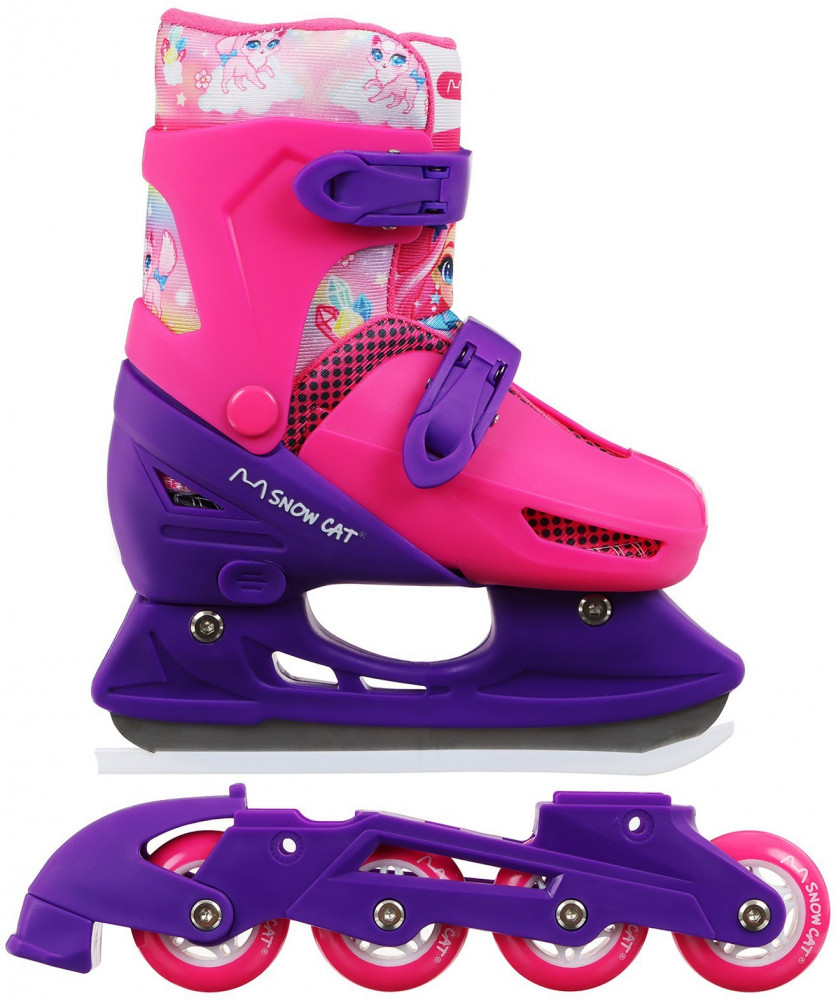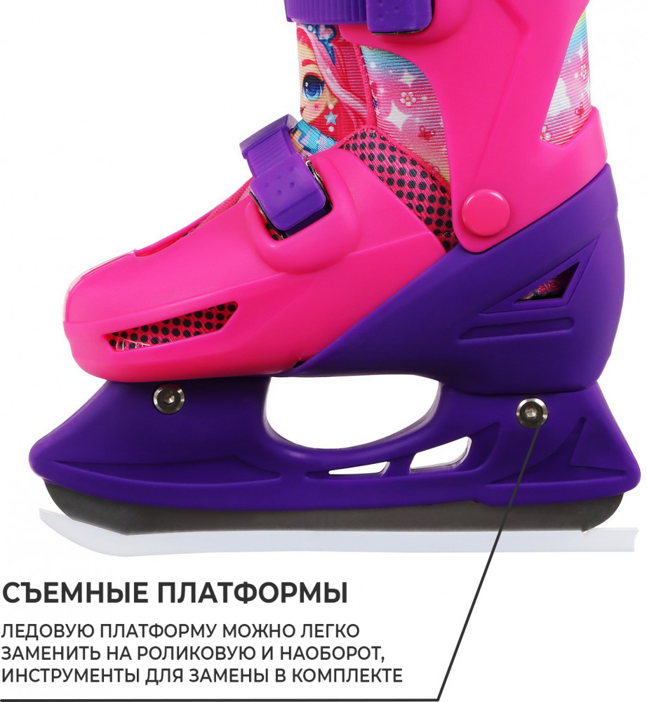 Коньки подходят для катания на открытом льду и крытых катках. Их легко надеть, отрегулировать и зафиксировать с помощью пластиковых клипс, которые расположены на голенище и в области ступни. Благодаря заменяемым ледовой и роликовой платформам можно кататься зимой и летом. Жёсткий корпус защищает ногу от травм, гарантирует плотную посадку и поддерживает голеностоп. Внутренняя подкладка из сетки и бархата согревает и создаёт комфорт. Коньки регулируются на 4 размера, это позволяет использовать их в течение нескольких сезонов. Для изменения размера необходимо зажать кнопку Push у основания пятки и раздвинуть две части пластикового каркаса до нужного положения. Внутренний сапожок состоит из двух частей, которые фиксируются c помощью липучек. При изменении размера его необходимо достать и закрепить в нужном положении. Универсальное лезвие из нержавеющей стали не поддаётся коррозии.