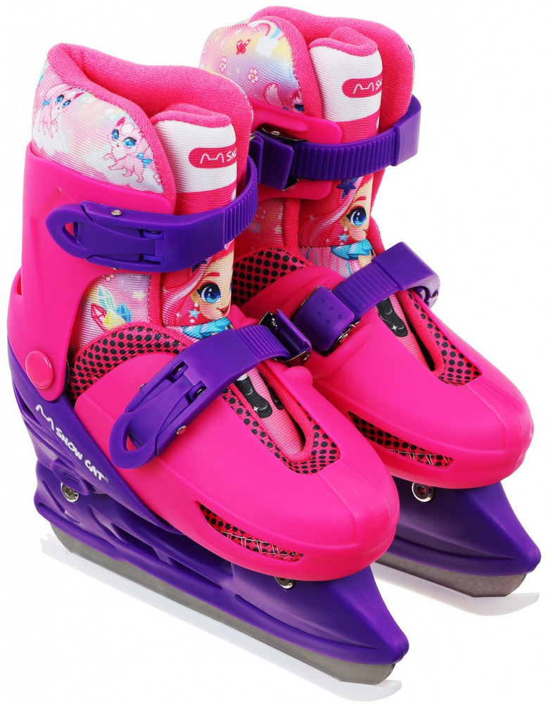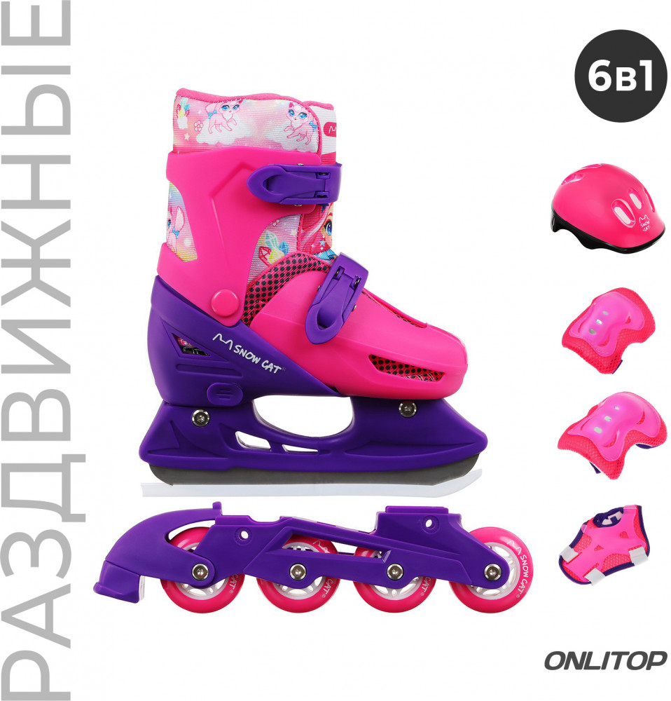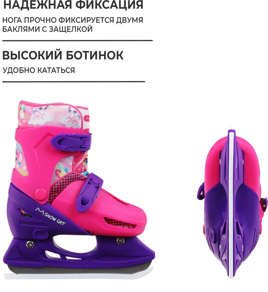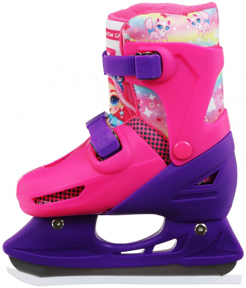 Коньки подходят для катания на открытом льду и крытых катках. Их легко надеть, отрегулировать и зафиксировать с помощью пластиковых клипс, которые расположены на голенище и в области ступни. Благодаря заменяемым ледовой и роликовой платформам можно кататься зимой и летом. Жёсткий корпус защищает ногу от травм, гарантирует плотную посадку и поддерживает голеностоп. Внутренняя подкладка из сетки и бархата согревает и создаёт комфорт. Коньки регулируются на 4 размера, это позволяет использовать их в течение нескольких сезонов. Для изменения размера необходимо зажать кнопку Push у основания пятки и раздвинуть две части пластикового каркаса до нужного положения. Внутренний сапожок состоит из двух частей, которые фиксируются c помощью липучек. При изменении размера его необходимо достать и закрепить в нужном положении. Универсальное лезвие из нержавеющей стали не поддаётся коррозии.