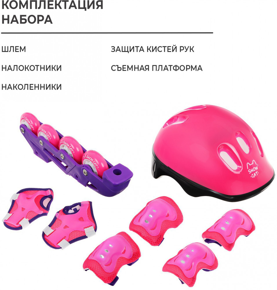 В набор входит комплект защиты: шлем, наколенники, налокотники и защита кистей рук.
