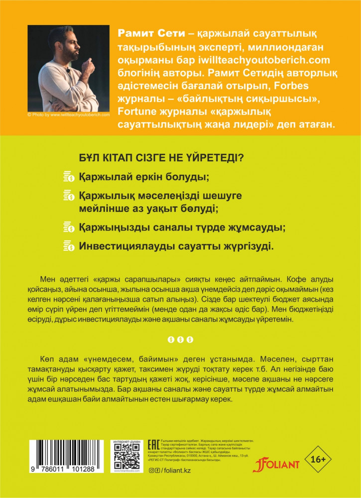 💳 Оплатить за товар можно при получении 🇰🇿 Есть бесплатная доставка по Казахстану от 1 дня 🎁 Копите бонусы с каждой покупки Серия: Әлемдік бестселлер «Бай болуды менен үйрен» кітабы — қаржы тақырыбында жазылған бестселлер кітаптардың бірі. Автор Рамит Сети «Бай өмірдің 10 ережесімен», «Саналы шығындар» жоспарымен және қарыздан құтылу, қаржылық еркіндікке жету сияқты өзінің жеке техникаларымен бөліседі. Кітап арқылы сізде ақшаға деген жаңа көзқарас қалыптасып, дұрыс үнемдеу, қаржы жинақтау, инвестиция құю, қорлар таңдау сияқты түрлі тәсілдерді меңгересіз. Сіздің «бай өміріңіз» өзіңізді басқарудан басталады. |