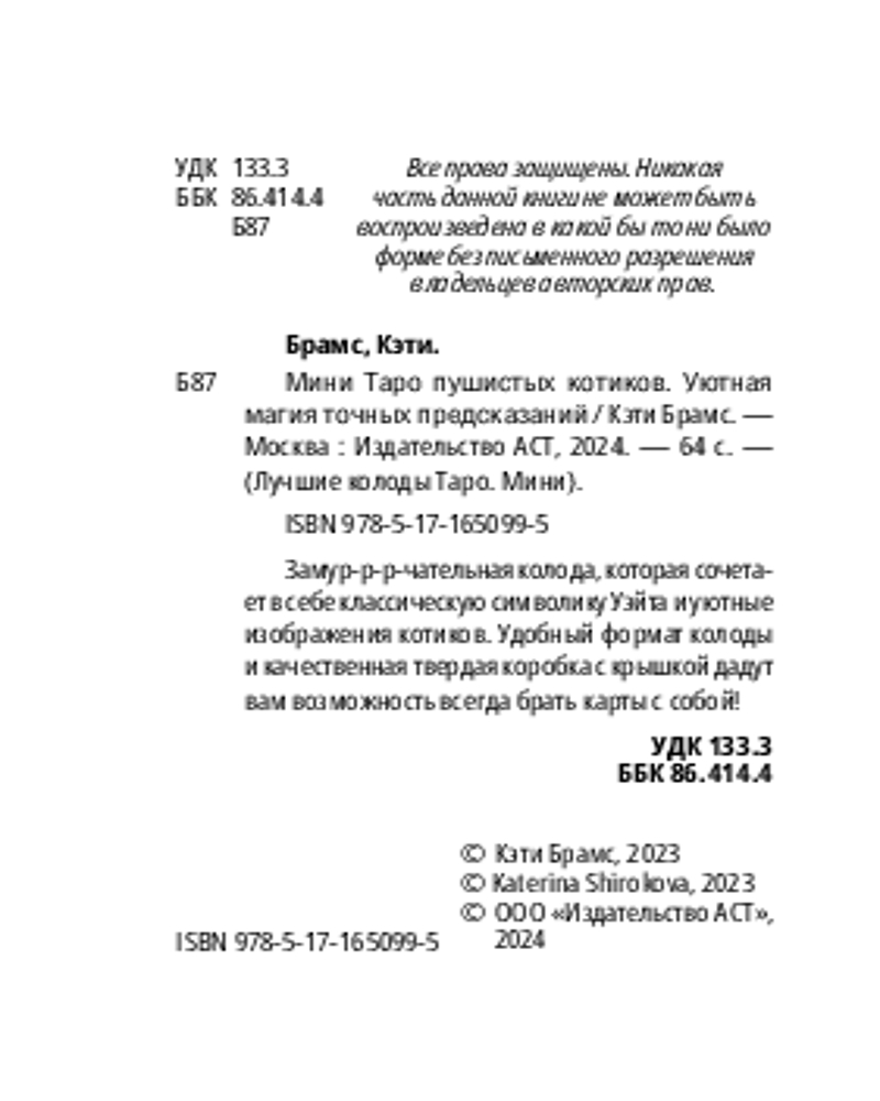 💳 Оплатить за товар можно при получении 🇰🇿 Есть бесплатная доставка по Казахстану от 1 дня 🎁 Копите бонусы с каждой покупки Серия: Лучшие колоды Таро. Мини Замур-р-р-чательная кошачья колода, которая сочетает в себе классическую символику Уэйта и уютные, домашние изображения котиков. |