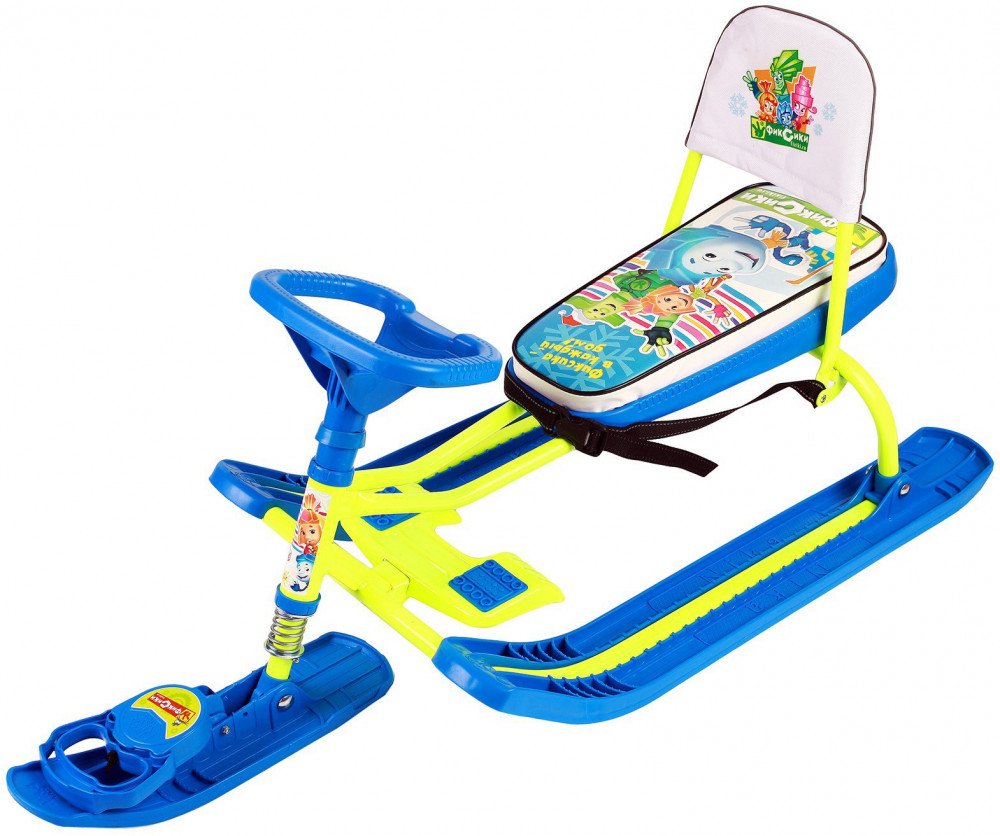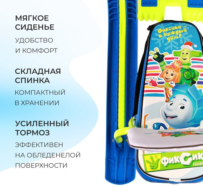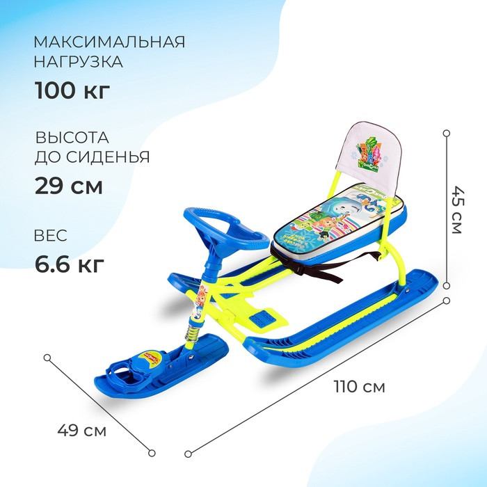 Снегокат предназначен для перевозки детей по плотному снегу или льду, катанию с горок. Имеет сварную конструкцию из стальных труб и пластиковых элементов. Оснащён мягким сиденьем, обтянутым искусственной кожей с рисунком, складной спинкой и двухточечным ремнём безопасности. Оборудован буксировочным тросом с автоматической намоткой и системой амортизации, которая обеспечивает комфортную поездку по крутым горкам и неровным поверхностям. Усиленный тормоз эффективен на обледенелой поверхности.