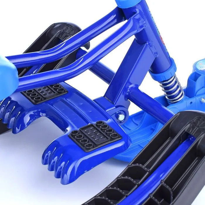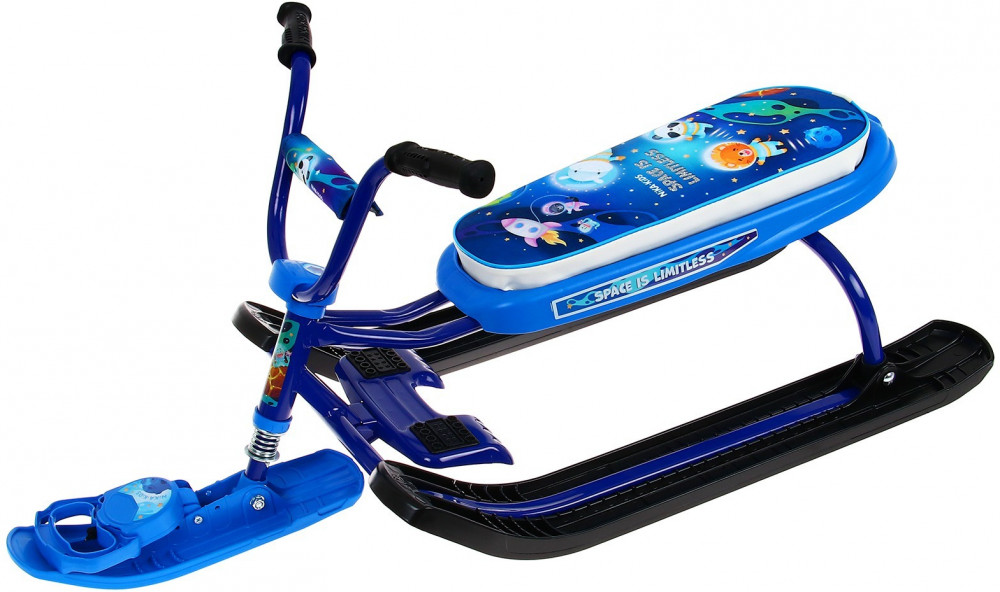 Снегокат предназначен для перевозки детей по плотному снегу или льду, катанию с горок. Имеет сварную конструкцию из стальных труб и пластиковых элементов. Оснащён мягким сиденьем, обтянутым искусственной кожей с рисунком. Оборудован буксировочным тросом с автоматической намоткой и системой амортизации, которая обеспечивает комфортную поездку по крутым горкам и неровным поверхностям. Усиленный тормоз эффективен на обледенелой поверхности. |