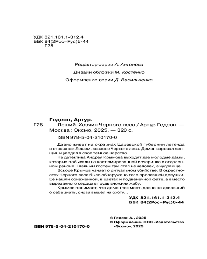 💳 Оплатить за товар можно при получении 🇰🇿 Есть бесплатная доставка по Казахстану от 1 дня 🎁 Копите бонусы с каждой покупки Серия: Черные лебеди. Мистические триллеры Давно живет на окраинах Царевской губернии легенда о страшном Лешем, хозяине Черного леса. Демон воровал женщин и уводил в свое темное царство. На детектива Андрея Крымова выходят две молодые дамы, которые побывали на костюмированной вечеринке в отдаленном районе. Главным гостем там стал не человек, а чудовище... Вскоре Крымов узнает о ритуальном убийстве. В окрестностях Черного леса было обнаружено тело пропавшей девушки. Ее нашли обнаженной, в цветах и подвенечной фате, а вместо вырезанного сердца в грудь вложили жабу. Крымов понимает, что демон тех мест, давно не дававший о себе знать, снова вышел на охоту... |