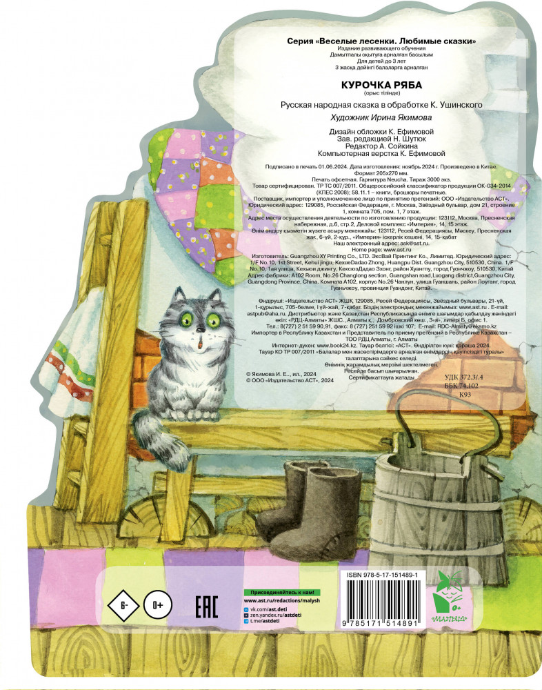 💳 Оплатить за товар можно при получении 🇰🇿 Есть бесплатная доставка по Казахстану от 1 дня 🎁 Копите бонусы с каждой покупки Серия: Веселые лесенки. Любимые сказки Любимая сказка «Курочка Ряба» в новом формате! Книжка-лесенка с индивидуальной вырубкой на каждом развороте сделает чтение с малышом еще более увлекательным, разовьет мелкую моторику, фантазию и внимание. А яркие и теплые иллюстрации известной художницы Ирины Якимовой, благодаря множеству деталей, надолго займут малыша, помогут развить воображение и творческое мышление. |