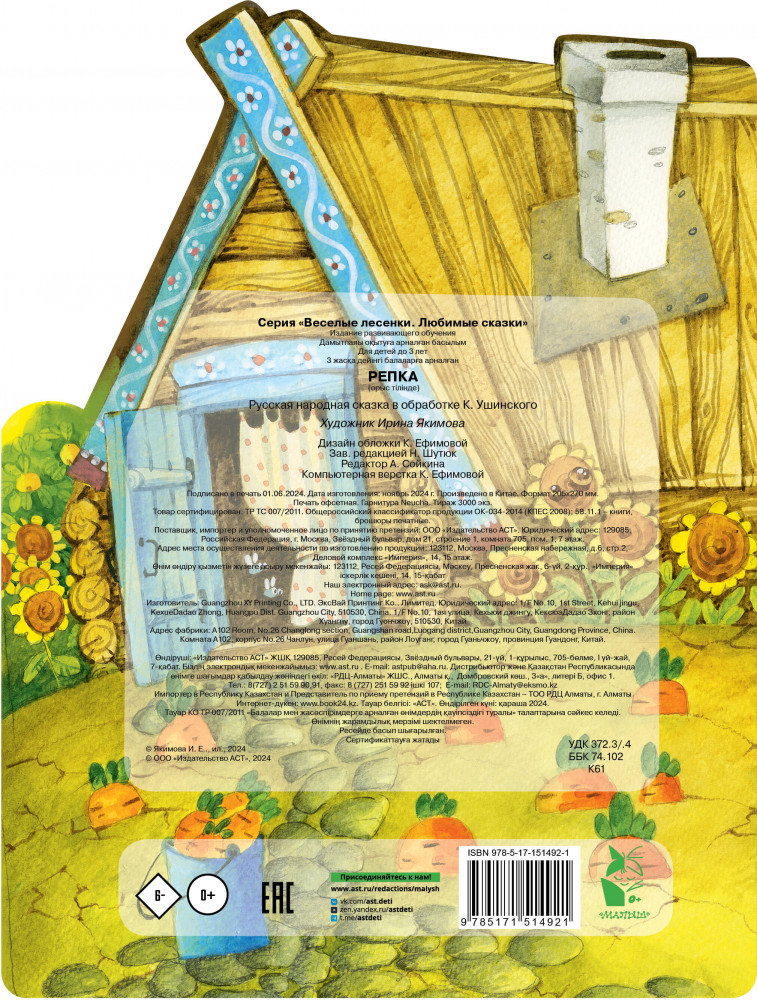 Любимая сказка «Репка» в новом формате! Книжка-лесенка с индивидуальной вырубкой на каждом развороте сделает чтение с малышом еще более увлекательным, разовьет мелкую моторику, фантазию и внимание. А яркие и теплые иллюстрации известной художницы Ирины Якимовой, благодаря множеству деталей, надолго займут малыша, помогут развить воображение и творческое мышление.