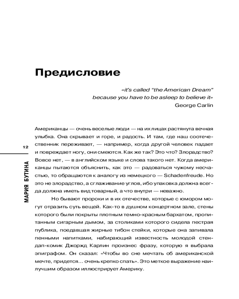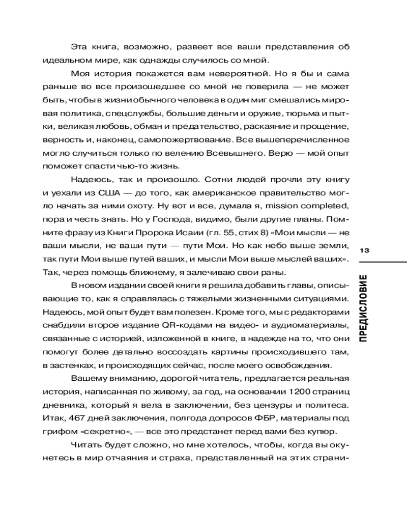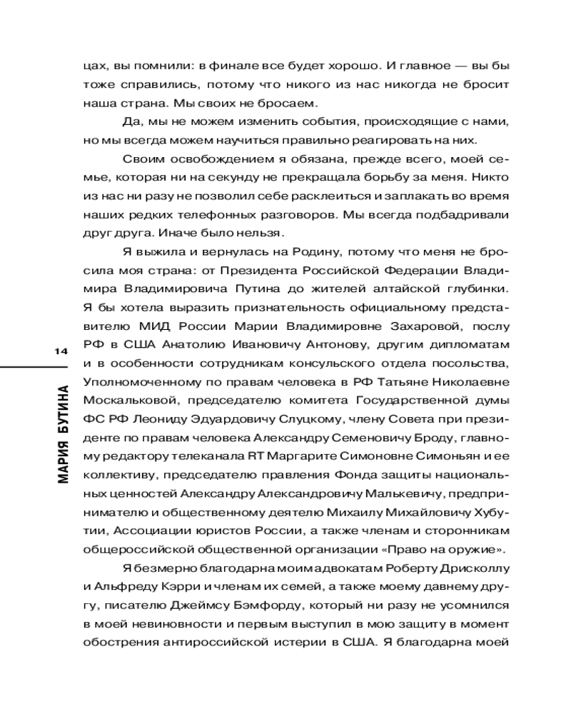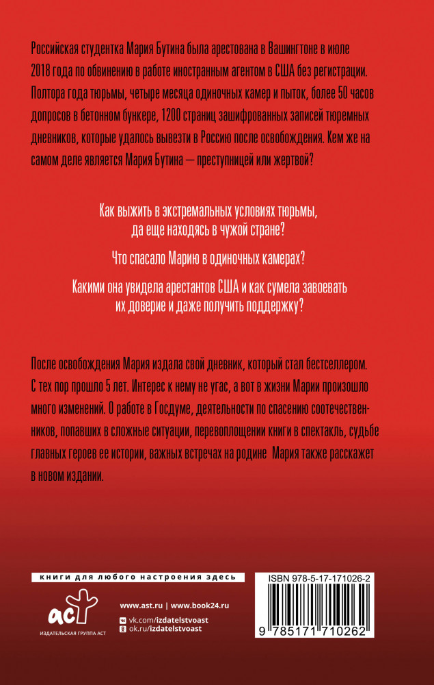 Серия: Портрет эпохи Российская студентка Мария Бутина была арестована в Вашингтоне в июле 2018 года по обвинению в работе иностранным агентом в США без регистрации. Полтора года тюрьмы, четыре месяца одиночных камер и пыток, более 50 часов допросов в бетонном бункере, 1200 страниц зашифрованных записей тюремных дневников, которые удалось вывезти в Россию после освобождения. Кем же на самом деле является Мария Бутина — преступницей или жертвой? Как выжить в экстремальных условиях тюрьмы, да еще находясь в чужой стране? Что спасало Марию в одиночных камерах? Какими она увидела арестантов США и как сумела завоевать их доверие и даже получить поддержку?  |