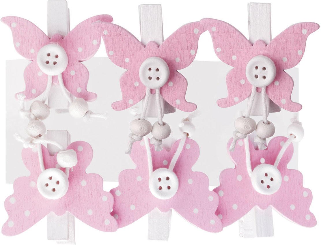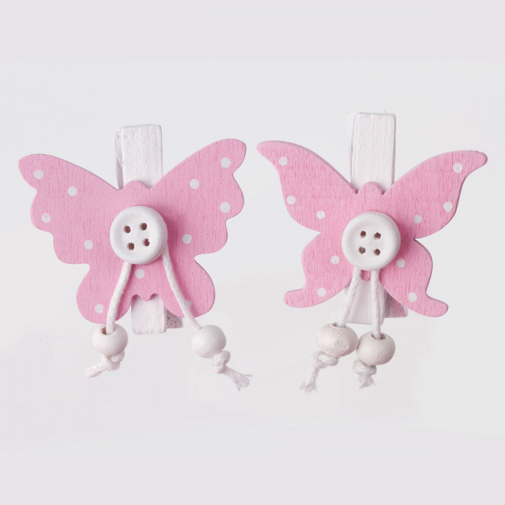 Изготовлены из дерева. Имеют классическую форму с фигурным топпером в виде бабочек с декоративными элементами. Выполнены в розовом цвете. Длина прищепки — 3,5 см. Предназначены для детей старше 3-х лет. Поставляются в пакете с европодвесом в количестве 6 штук.