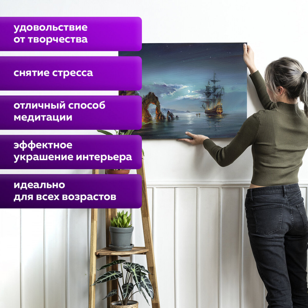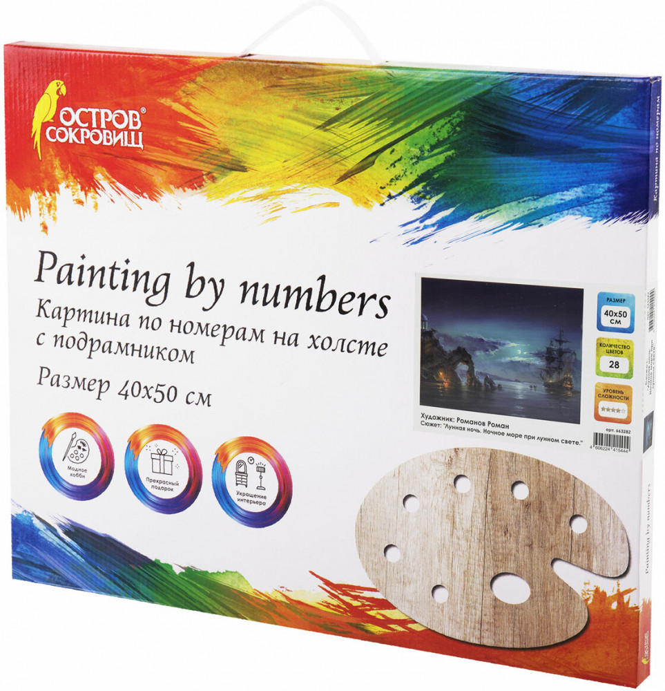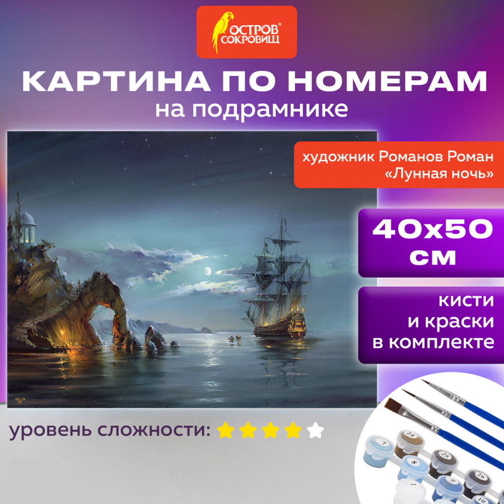 Картины по номерам на холсте с подрамником размером 40 × 50 см с дизайнами по картинам российских художников — это отличный способ почувствовать себя художником и интересно провести время. Все необходимое для рисования — в наборе. Представлен сюжет по картине «Лунная ночь. Ночное море при лунном свете» российского художника Романа Романова.