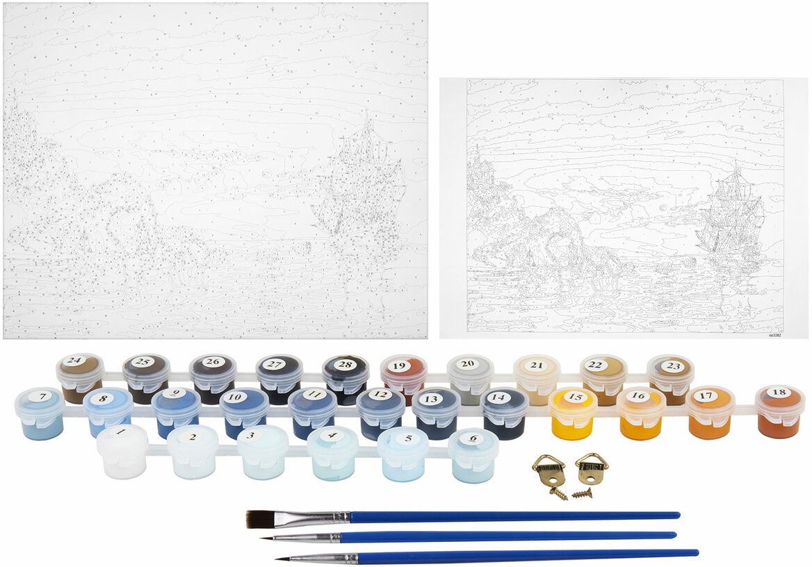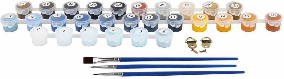 В наборе: 1 хлопковый холст на подрамнике с контуром, 1 лист бумаги для тренировки, набор из 28 акриловых красок объемом 3 мл каждая, 3 синтетические кисти и комплект металлических креплений для подвешивания на стену.