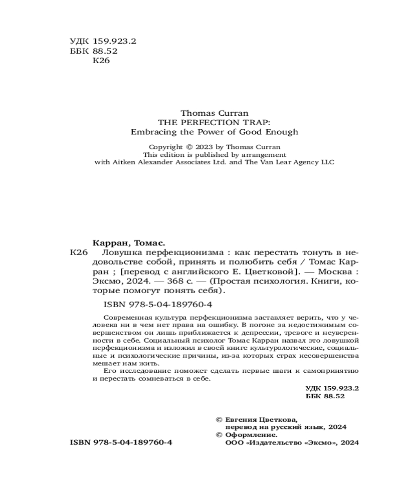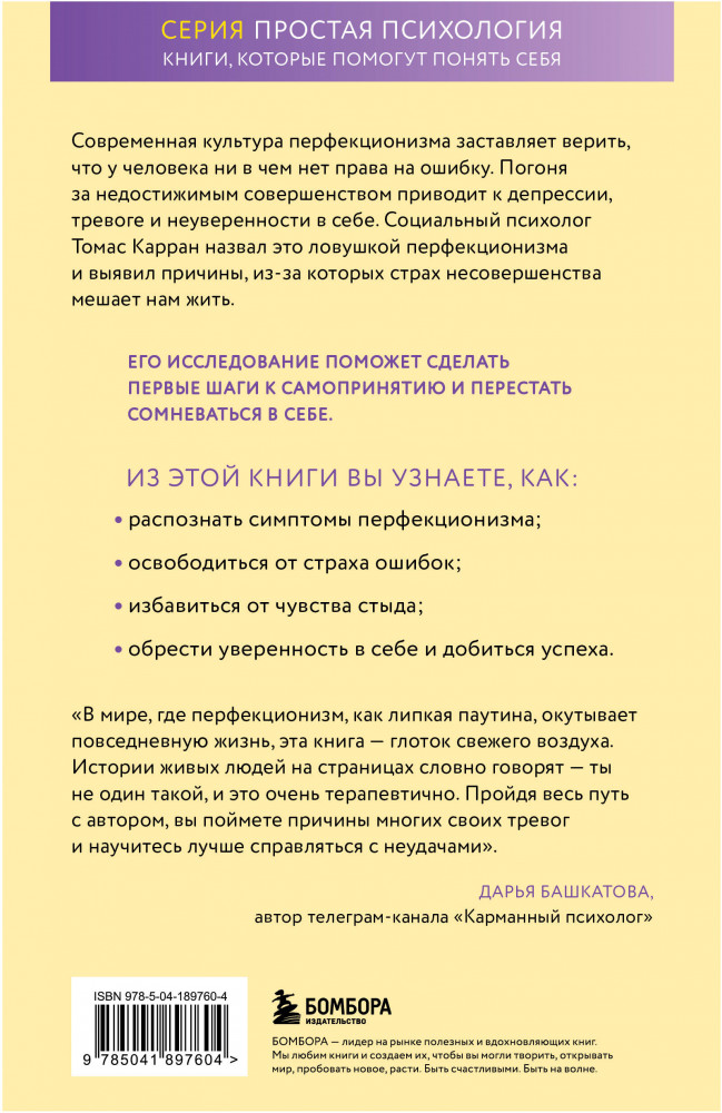 💳 Оплатить за товар можно при получении 🇰🇿 Есть бесплатная доставка по Казахстану от 1 дня 🎁 Копите бонусы с каждой покупки Серия: Простая психология. Книги, которые помогут понять себя Современная культура перфекционизма заставляет верить, что у человека ни в чем нет права на ошибку. Погоня за недостижимым совершенством приводит к депрессии, тревоге и неуверенности в себе. Социальный психолог Томас Карран назвал это ловушкой перфекционизма и выявил культурологические, социальные и психологические причины, из-за которых страх несовершенства мешает нам жить. Его исследование поможет сделать первый шаг к самопринятию и узнать немного больше о себе и мире, в котором мы живем. |