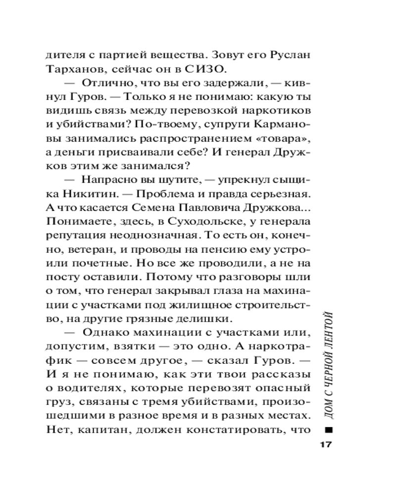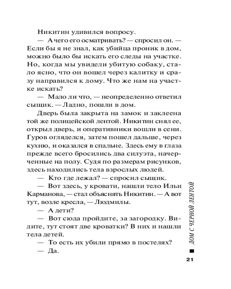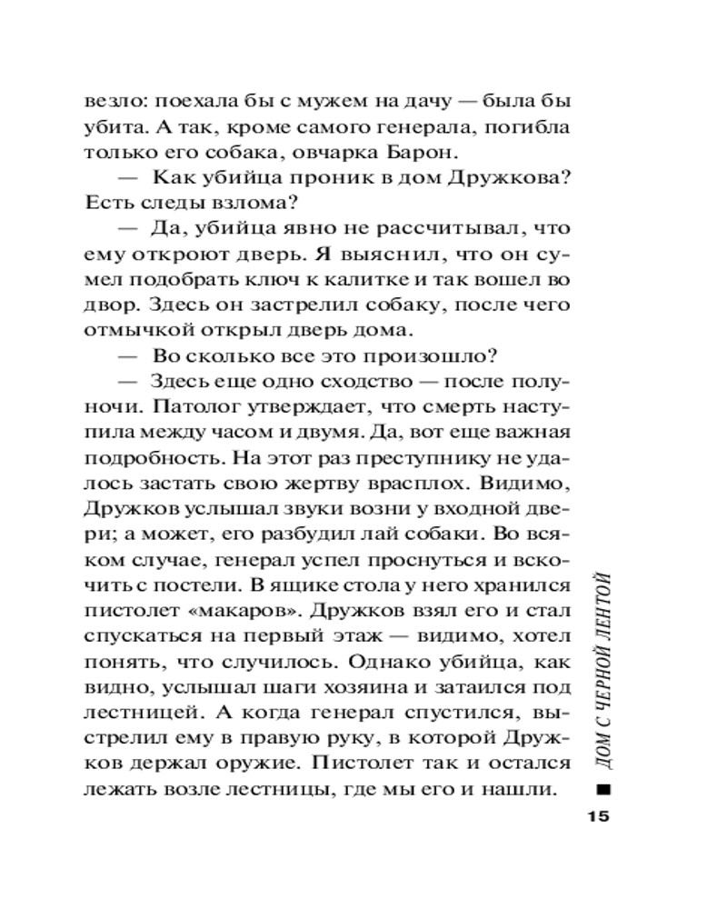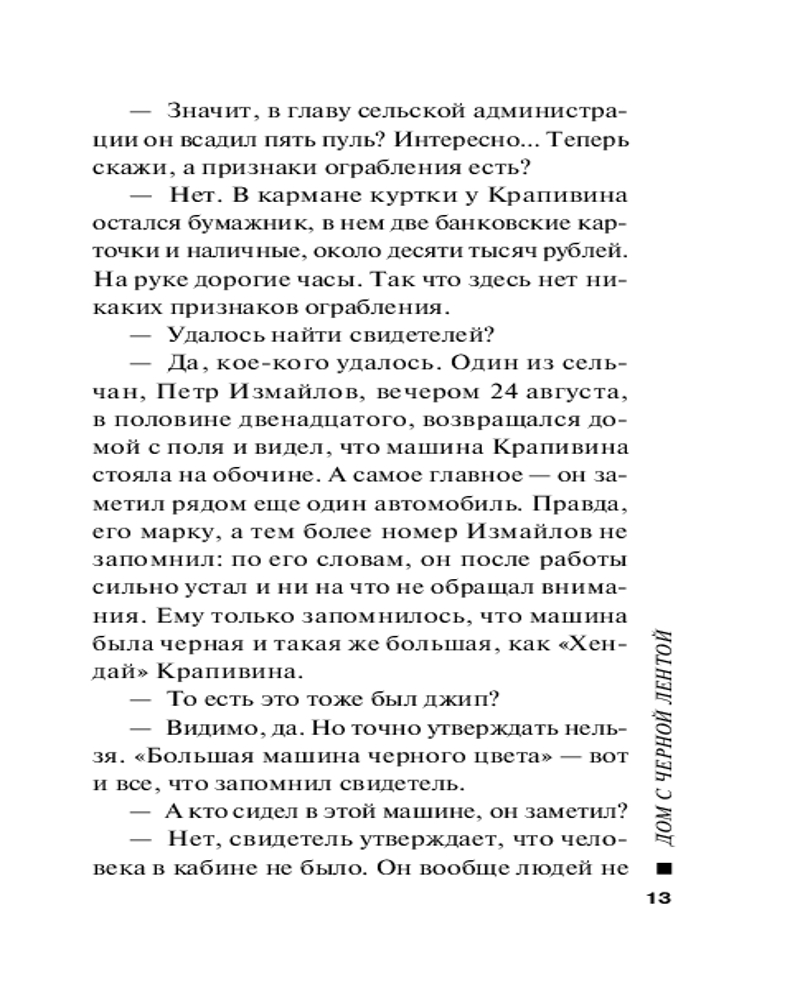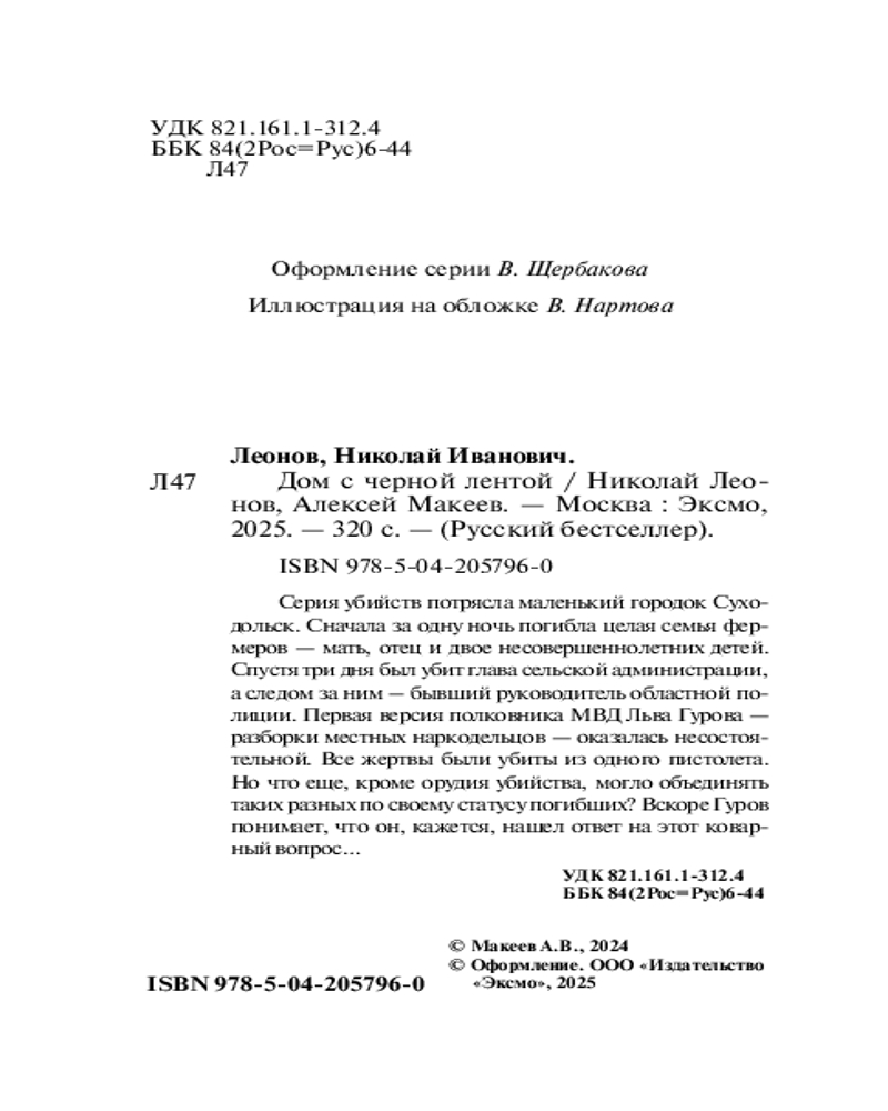 Дом с черной лентойАлексей Викторович Макеев, Николай Иванович Леонов В данный момент этот товар отсутствует в продаже. Возможно, у нас найдется аналогичный или похожий товар здесь. Серия: Русский бестселлер (обложка) Серия убийств потрясла маленький городок Суходольск. Сначала за одну ночь погибла целая семья фермеров — мать, отец и двое несовершеннолетних детей. Спустя три дня был убит глава сельской администрации, а следом за ним — бывший руководитель областной полиции. Первая версия полковника МВД Льва Гурова — разборки местных наркодельцов — оказалась несостоятельной. Все жертвы были убиты из одного пистолета. Но что еще, кроме орудия убийства, могло объединять таких разных по своему статусу погибших? Вскоре Гуров понимает, что он, кажется, нашел ответ на этот коварный вопрос... |