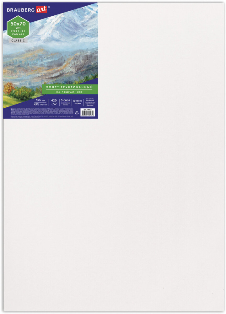 Среднезернистая фактура обеспечивает холсту универсальность в использовании, позволяет писать в различных техниках. Односторонний трехслойный акриловый грунт позволяет сохранить цвета неизменными, не допуская их прожухания. Холст прямоугольной формы на подрамнике полностью готов к работе. Размер — 50 × 70 см. Подрамник — 17 × 38 мм. Идеально натянутый грунтованный холст дает возможность безотлагательно приступить к созданию шедевра.