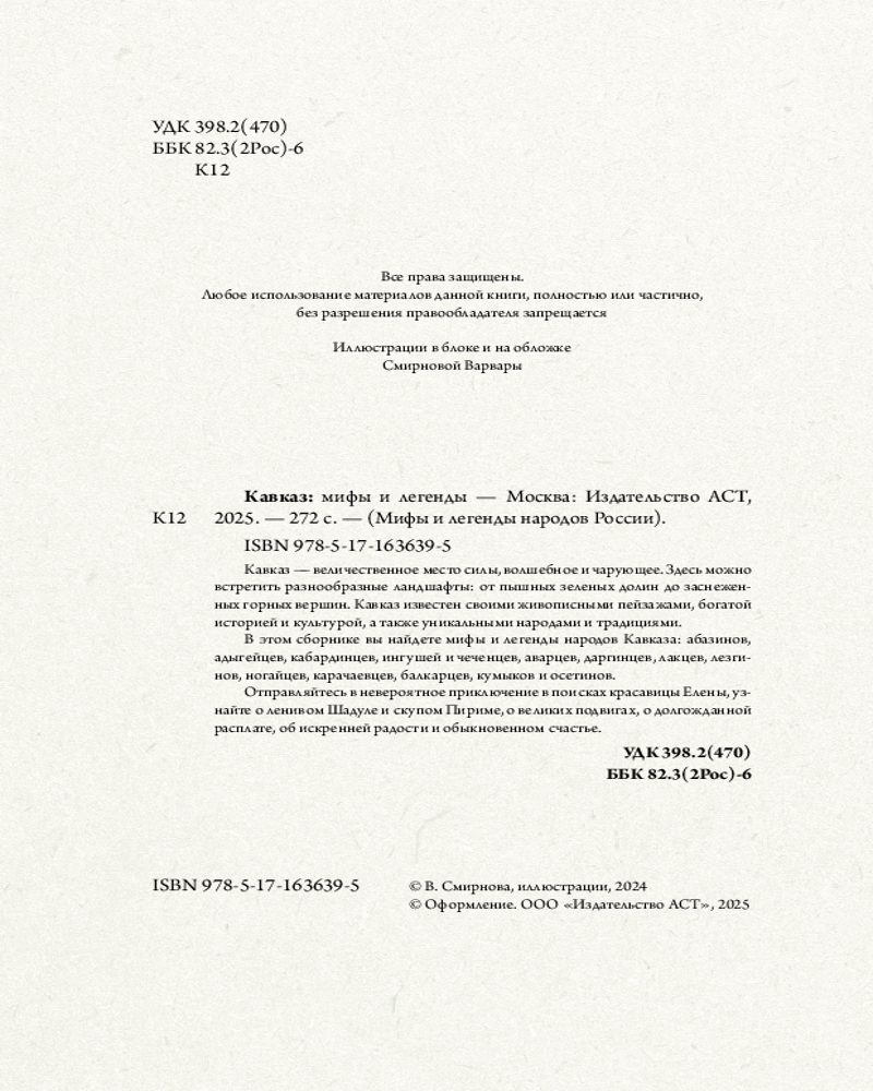 💳 Оплатить за товар можно при получении 🇰🇿 Есть бесплатная доставка по Казахстану от 1 дня 🎁 Копите бонусы с каждой покупки Серия: Мифы и легенды народов России Кавказ — величественное место силы, волшебное и чарующее. Здесь можно встретить разнообразные ландшафты: от пышных зеленых долин до заснеженных горных вершин. Кавказ известен своими живописными пейзажами, богатой историей и культурой, а также уникальными народами и традициями. В этом сборнике вы найдете мифы и легенды народов Кавказа: абазинов, адыгейцев, кабардинцев, ингушей и чеченцев, аварцев, даргинцев, лакцев, лезгинов, ногайцев, карачаевцев, балкарцев, кумыков и осетин. Отправляйтесь в невероятное приключение в поисках красавицы Елены, узнайте о ленивом Шадуле и скупом Пириме, о великих подвигах, о долгожданной расплате, об искренней радости и обыкновенном счастье. |