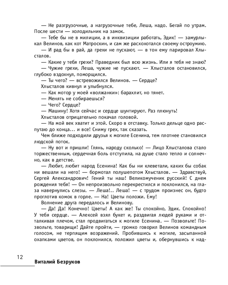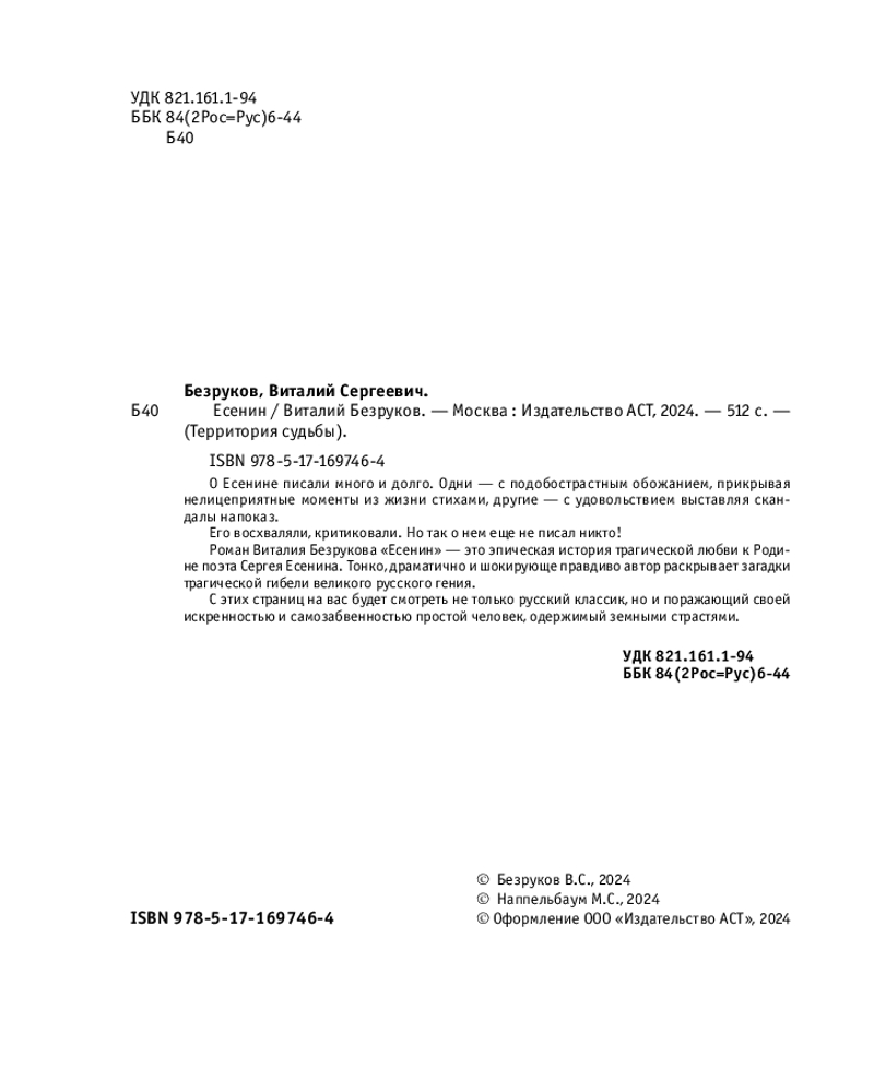 Серия: Территория судьбы О Есенине писали много и долго. Одни — с подобострастным обожанием, прикрывая нелицеприятные моменты из жизни стихами, другие — с удовольствием выставляя скандалы напоказ. Его восхваляли, критиковали. Но так о нем еще не писал никто! Роман Виталия Безрукова «Есенин» — это эпическая история трагической любви к Родине поэта Сергея Есенина. Тонко, драматично и шокирующе правдиво автор раскрывает загадки трагической гибели великого русского гения. С этих страниц на вас будет смотреть не только русский классик, но и поражающий своей искренностью и самозабвенностью простой человек, одержимый земными страстями. |