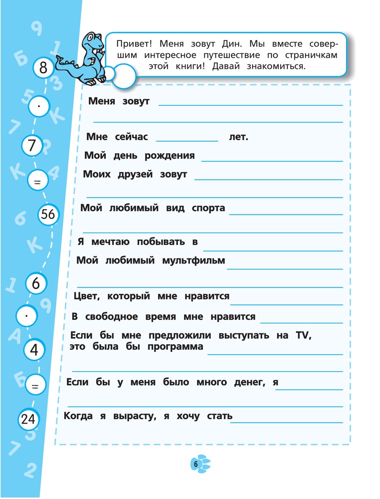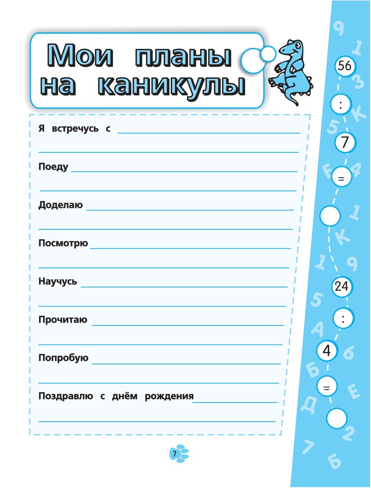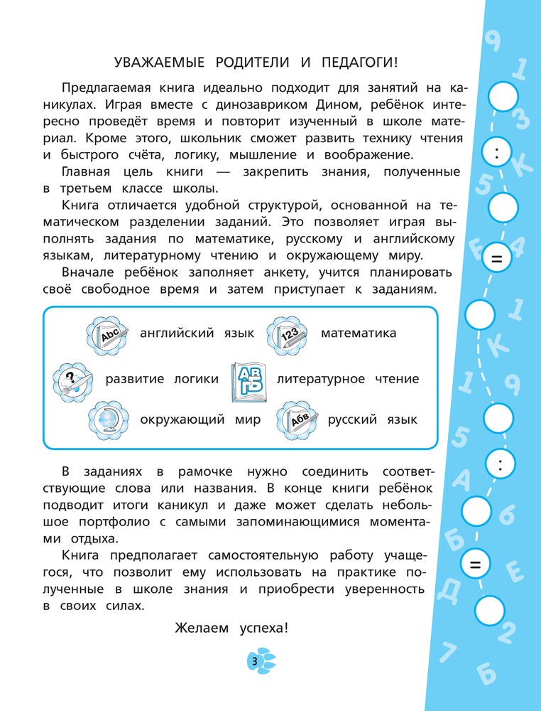 В данный момент этот товар отсутствует в продаже. Возможно, у нас найдется аналогичный или похожий товар здесь. Серия: Интересные каникулы Предлагаемая книга идеально подходит для занятий школьников во время каникул. Основная цель — закрепить знания, полученные в 3-м классе. Уникальная структура пособия основана на принципе пошаговой игры, что позволяет легко контролировать правильность выполнения каждого задания. Совершая увлекательное путешествие вместе с динозавриком, ребенок весело и интересно проведет время и между делом повторит изученный в течение учебного года материал. Кроме того, школьник сможет развить технику чтения и быстрого счета, логику, мышление и воображение.