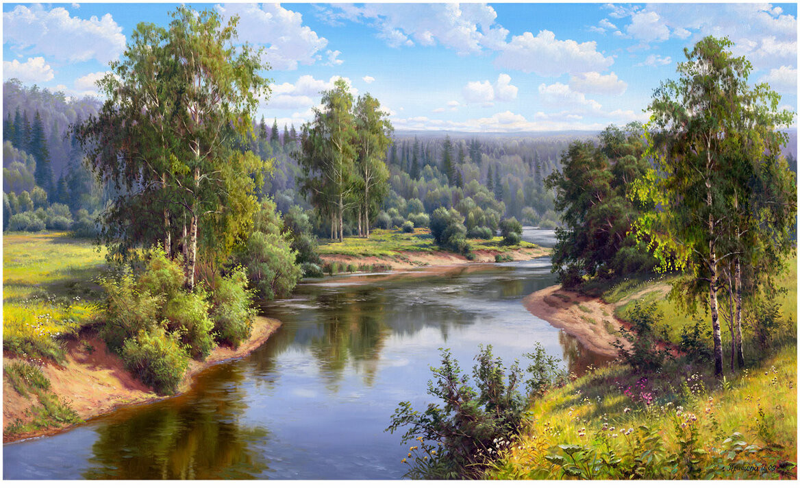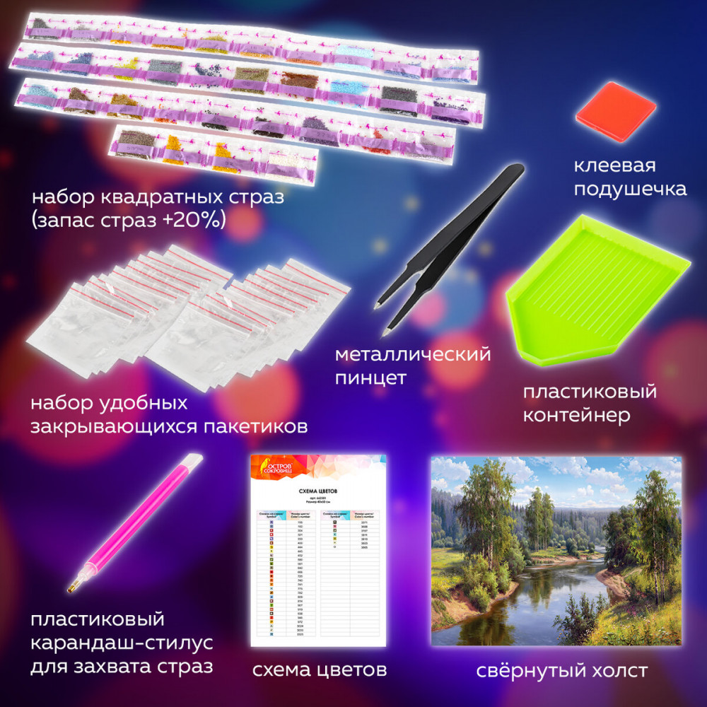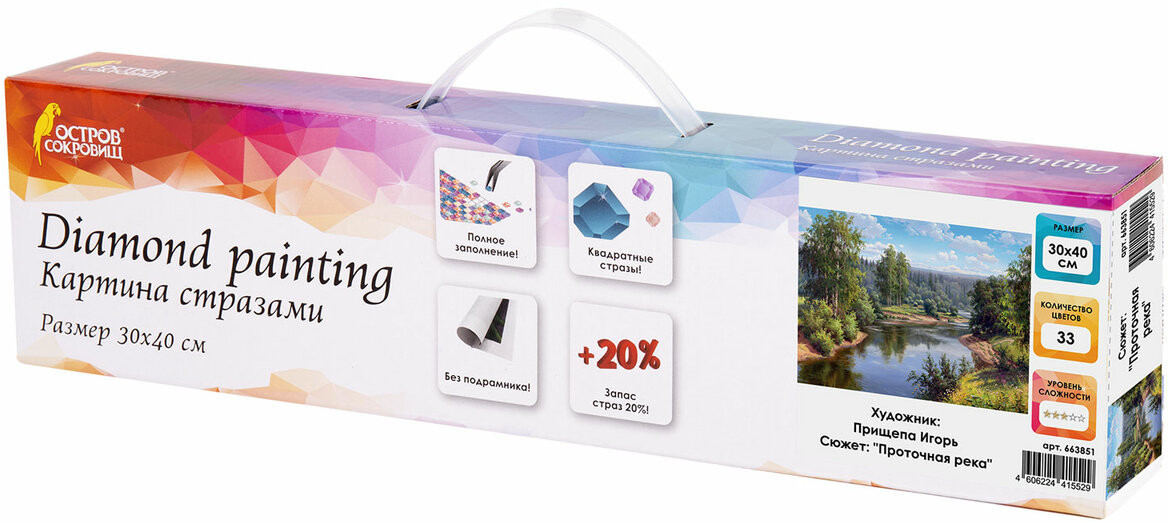 Картины стразами Остров Сокровищ — это наборы для создания картин в технике алмазной мозаики с сюжетами известных российских художников. В наборе содержится все необходимое для создания шедевра своими руками. Картина стразами «Проточная река» основывается на одноименном произведении российского художника Игоря Прищепы.