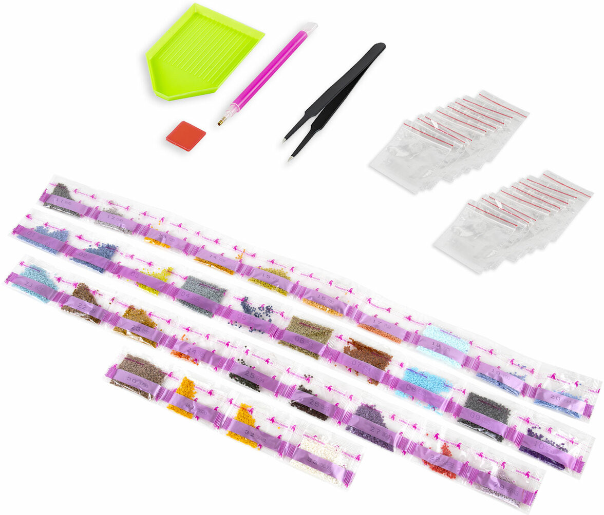 Размер готовой картины составляет 30 × 40 см. Картина полностью заполняется квадратными акриловыми стразами, благодаря чему готовая работа блистает и переливается на свету. Техника алмазной мозаики проста в исполнении и не требует владения никакими специальными навыками. Все необходимые для работы материалы и инструменты входят в набор. С подробной инструкцией можно ознакомиться на упаковке.