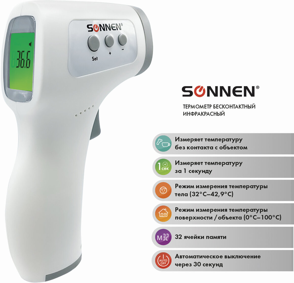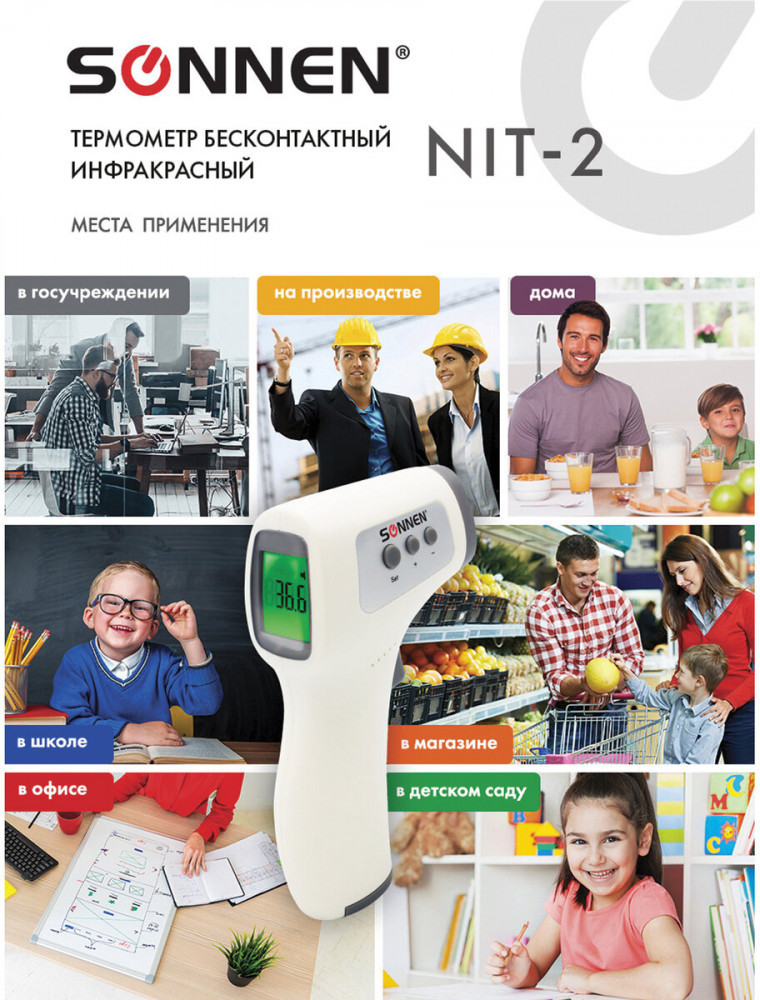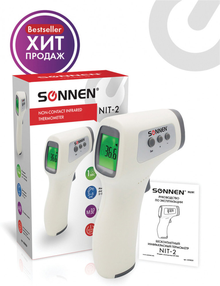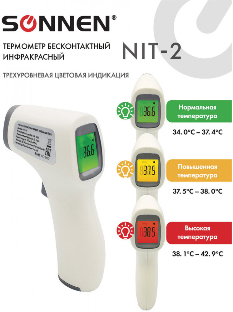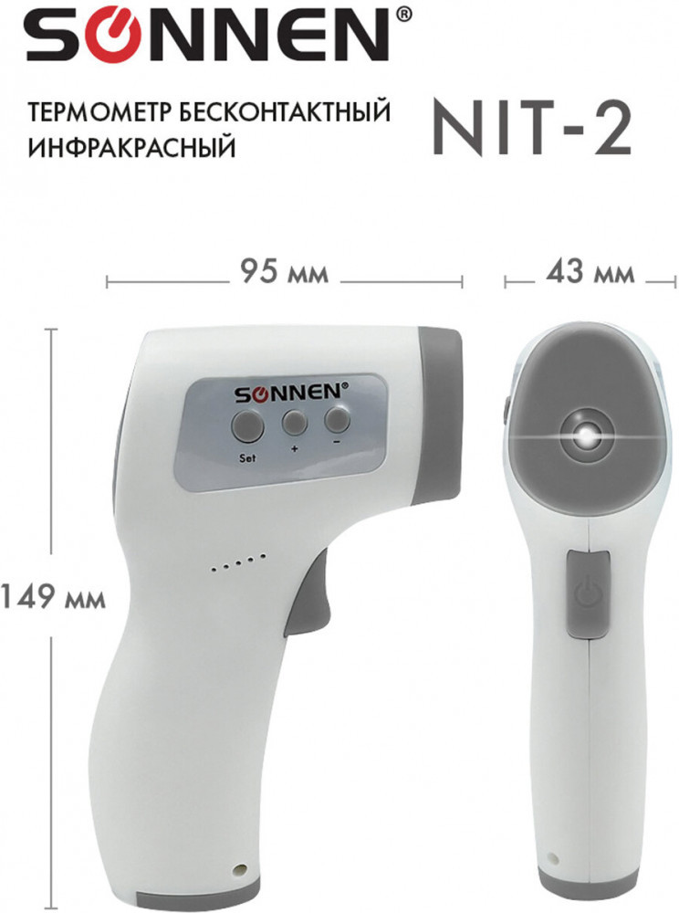 Бесконтактный инфракрасный термометр Sonnen NIT-2 определяет температуру тела человека, объекта или жидкости на дистанции и без контакта за 1 секунду. Инфракрасный бесконтактный термометр идеально подойдет как для домашнего использования, так и для организаций любого профиля: офисы и предприятия, общественный транспорт, такси, кафе, бары и рестораны. Простой, точный и бесконтактный способ измерения температуры тела удобен при необходимости одновременного обследования большого количества людей.