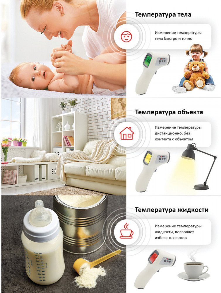 Принцип действия инфракрасных термометров основан на регистрации данных инфракрасного излучения, исходящего от тела человека или поверхности объекта. Внутренняя память на 32 последних измерения позволяет отследить динамику изменения температуры. Цветовая подсветка дисплея, изменяющаяся в зависимости от температуры, позволяет безошибочно определить температуру и состояние человека.
