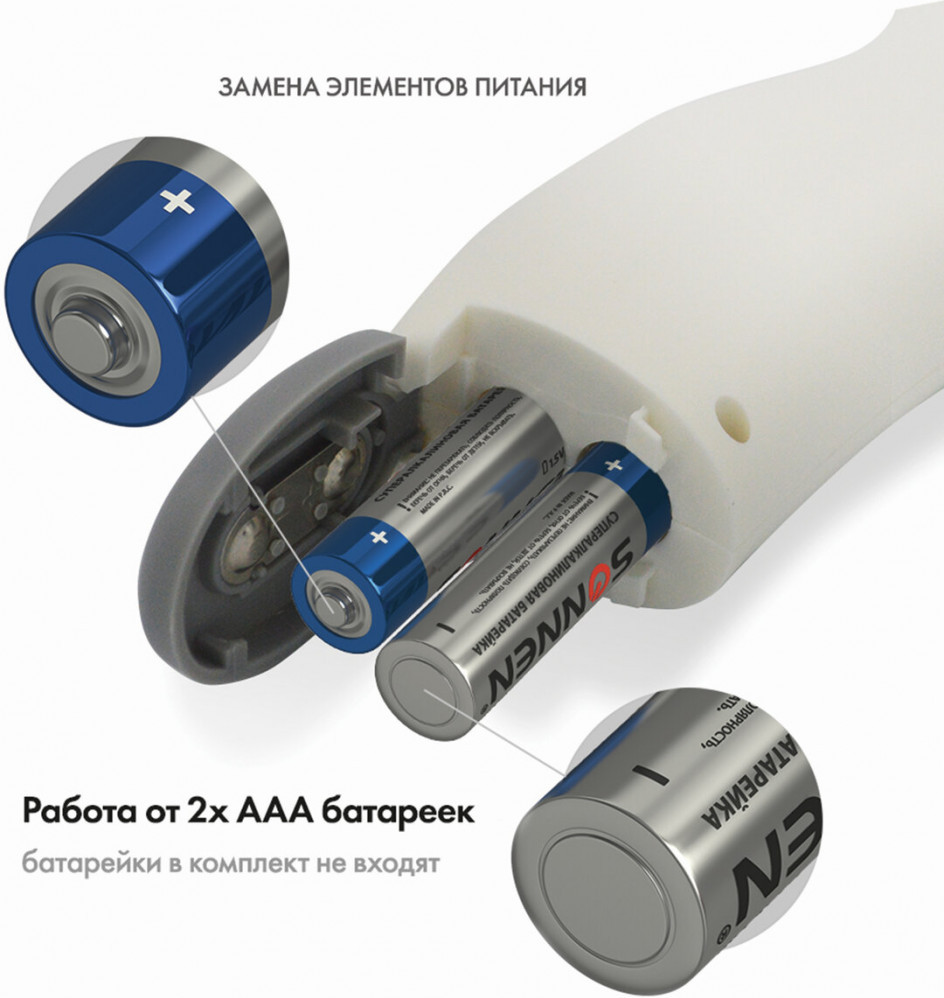 Питание прибора осуществляется от 2 батареек ААА (батарейки не входят в комплект).