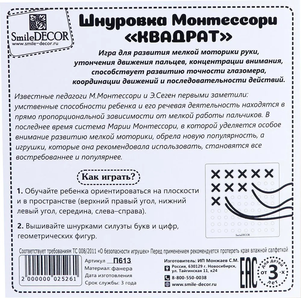 Smile Decor Игра настольная «Шнуровка Монтессори»В данный момент этот товар отсутствует в продаже. Возможно, у нас найдется аналогичный или похожий товар здесь. Известные педагоги М. Монтессори и Э. Сеген первыми заметили: умственные способности ребенка и его речевая деятельность находятся в прямо пропорциональной зависимости от мелкой работы пальчиков. Шнуровка «квадрат» от Smile Decor изготовлена с учетом рекомендательной системы Марии Монтессори. Шнуровка способствует развитию мелкой моторики руки, утончения движения пальцев, концентрации внимания, точности глазомера, координации движений и последовательности действий. |