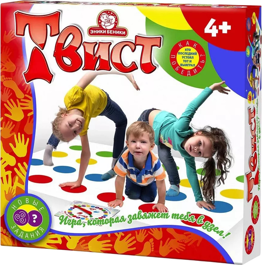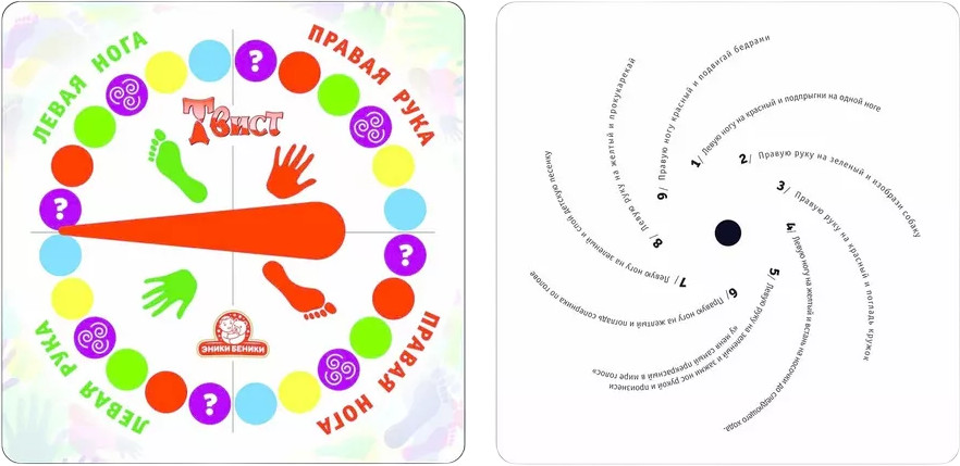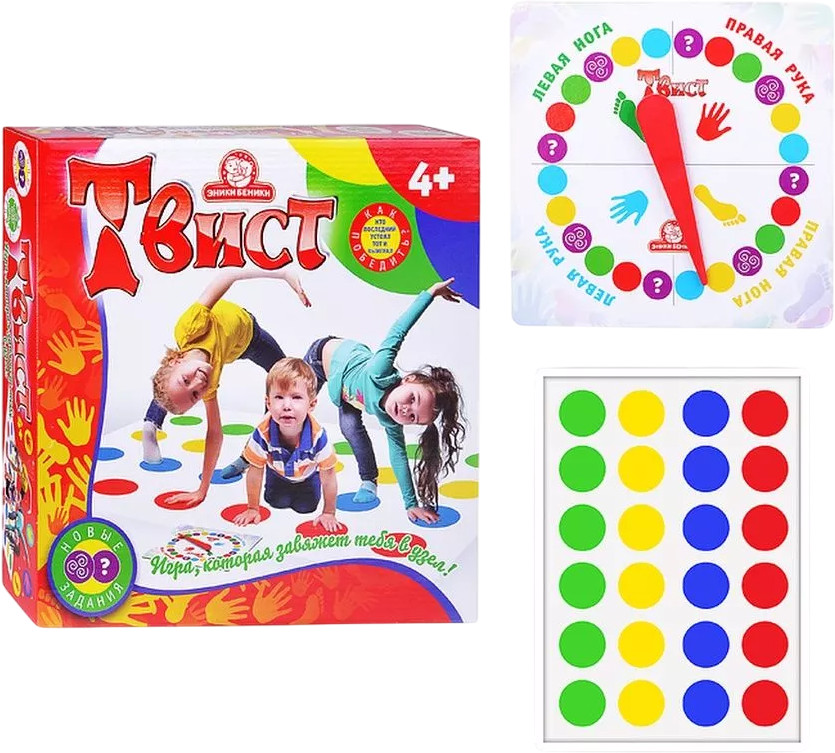 Эники Беники Игра «Твистер»В данный момент этот товар отсутствует в продаже. Возможно, у нас найдется аналогичный или похожий товар здесь. Оригинальная подвижная игра «Твистер» идеально подходит для проведения детских праздников, вечеринок, дружеских посиделок. Она не даст заскучать. Следуя указаниям вращающейся рулетки, участники игры переставляют руки и ноги по игровому полю, на котором изображены разноцветные круги, стараясь сохранять баланс и не отрывать конечности от кругов на игровой поверхности. Выигрывает тот, кто сумел не упасть. Все элементы игры выполнены из качественных и прочных материалов, окрашены безопасными нетоксичными красками, устойчивыми к износу и выгоранию. |