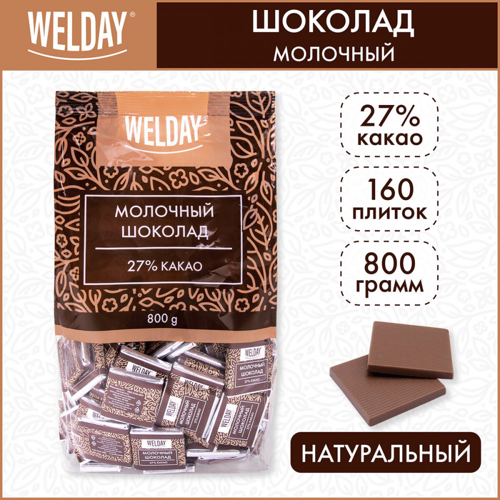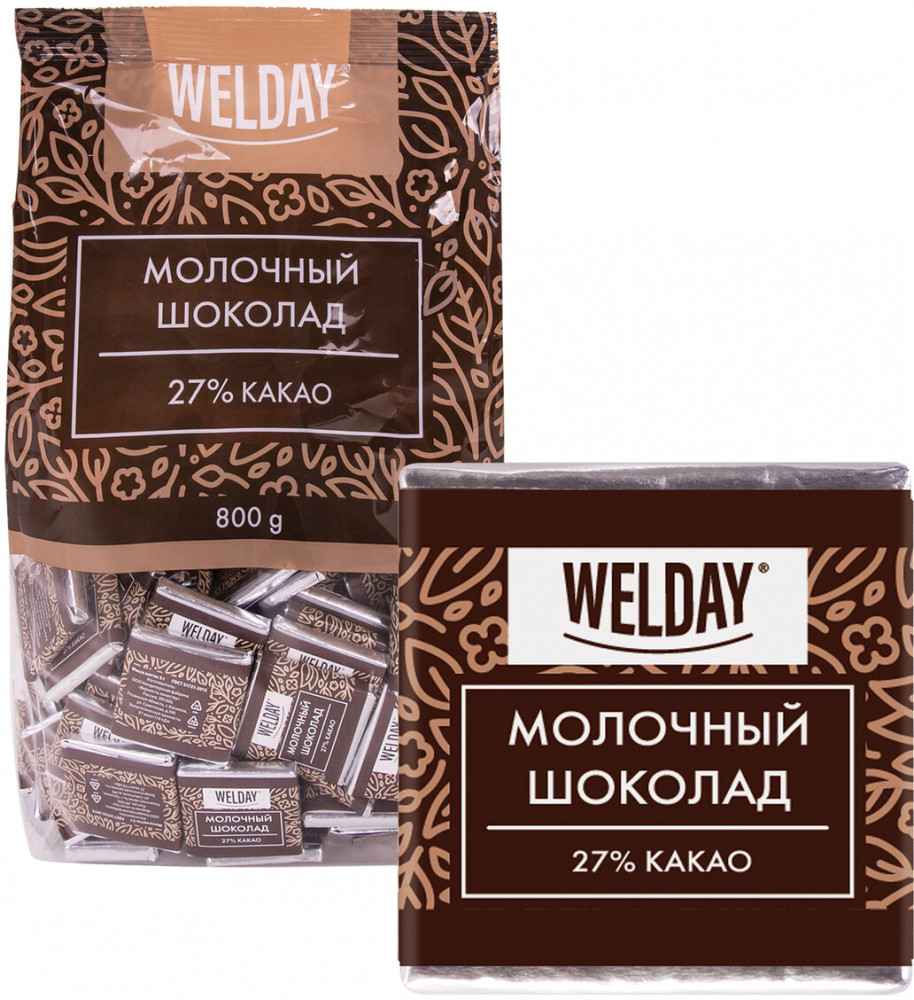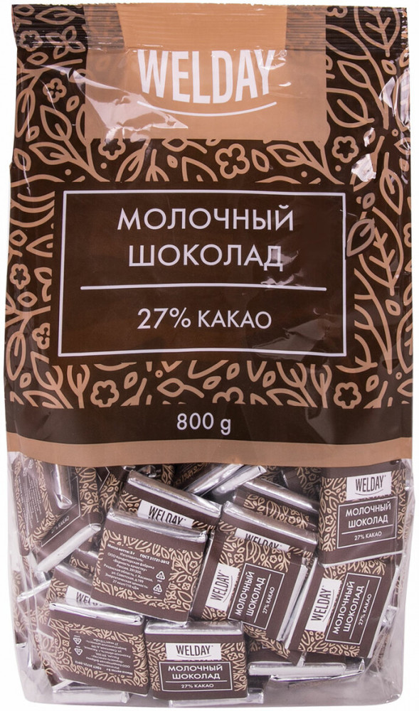 Качественный шоколад Welday «Молочный 27%» — это вкусный и полезный десерт, который станет превосходным дополнением к чашечке чая или кофе. Каждая плитка упакована в серебряную фольгу и бумажную этикетку с оригинальным дизайном.