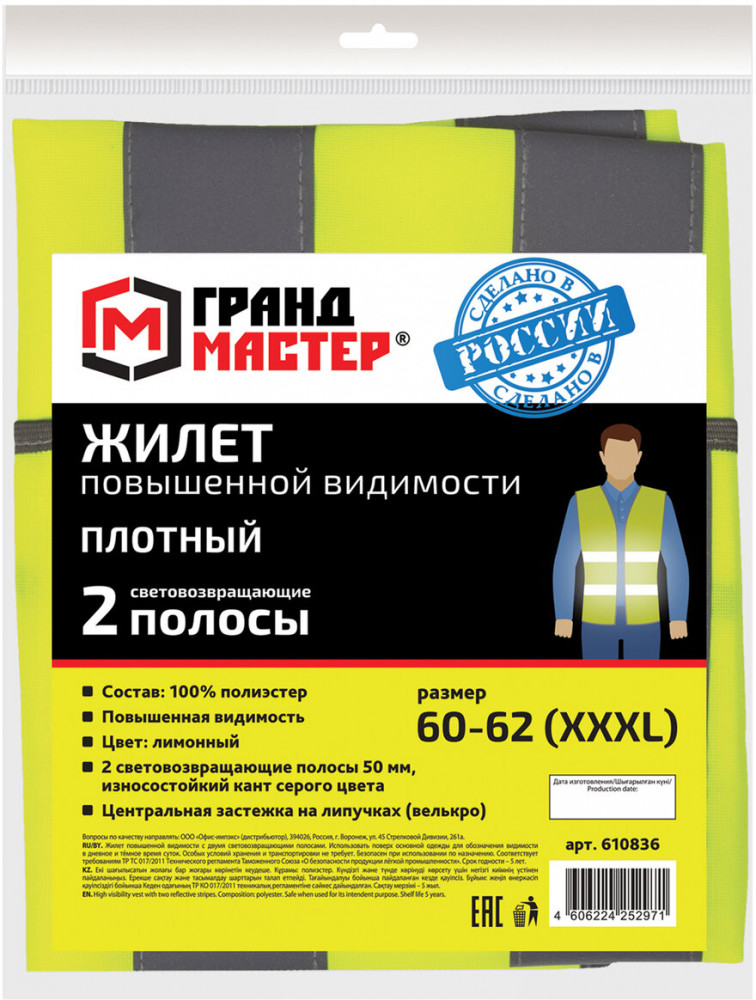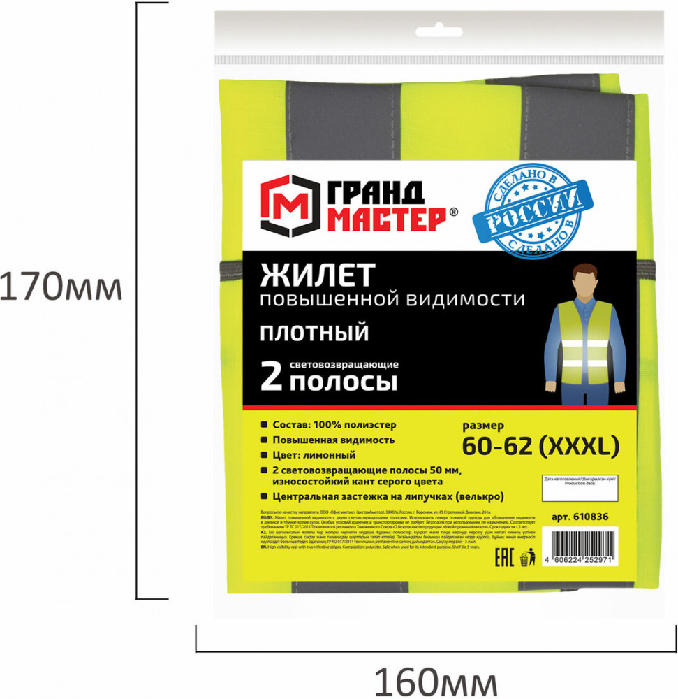 Сочетание неонового лимонного цвета и светоотражающих полос обеспечивает его заметность как днем, так и в темное время суток. Жилет с центральной застежкой на ленту-липучку надевается поверх другой одежды. Изделие соответствует второму классу защиты, изготовлено из 100% полиэстера плотностью 120 г/м2. Ширина светоотражающей ленты — 50 мм.