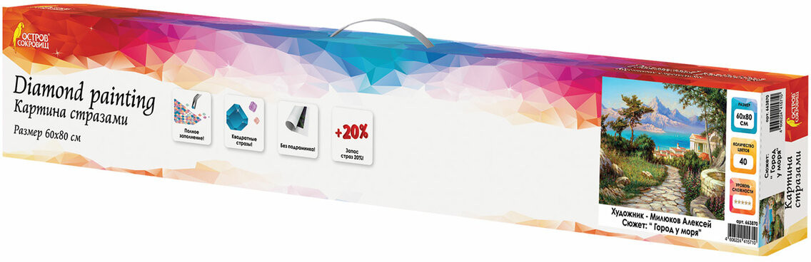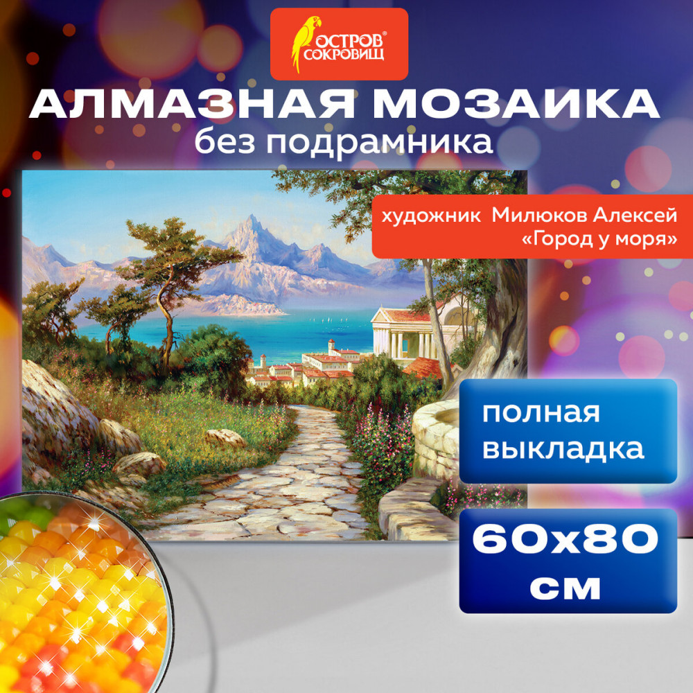 Картины стразами «Остров сокровищ» — это наборы для создания картин в технике алмазной мозаики с сюжетами известных российских художников. В наборе содержится все необходимое для создания шедевра своими руками. Картина стразами «Город у моря» основывается на одноименном произведении российского художника Алексея Милюкова.