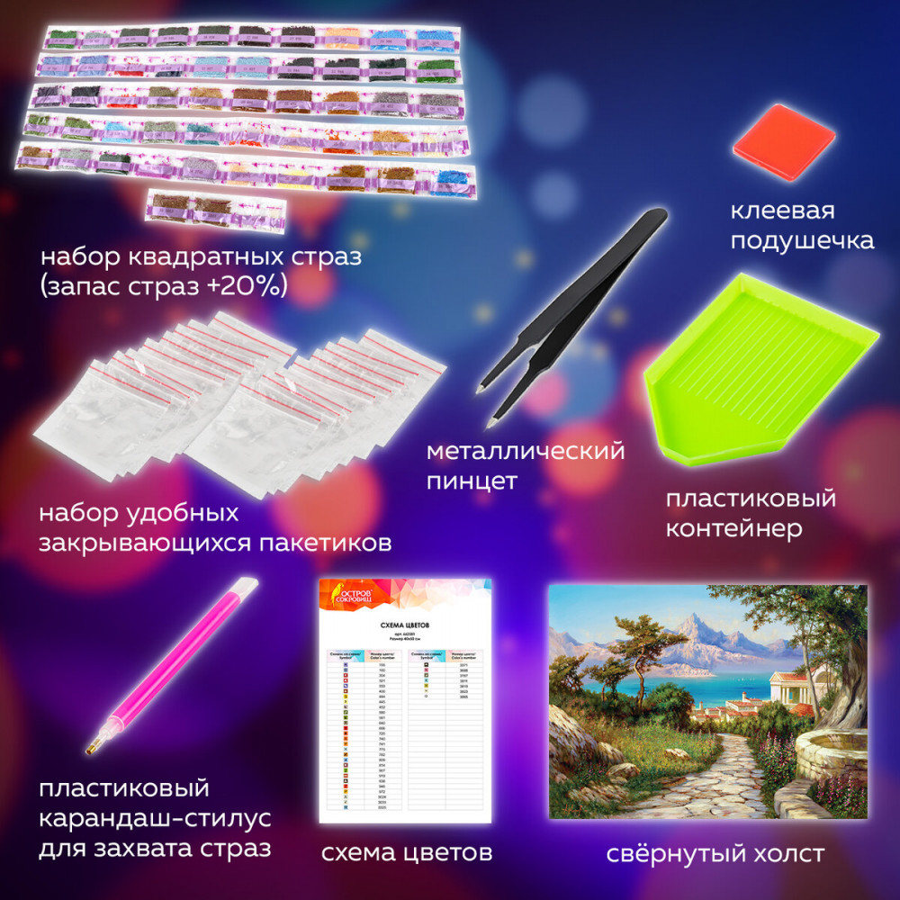 Алмазная мозаика — прекрасное хобби, подходящее для терпеливых людей, ценящих красоту. Картины стразами «Остров сокровищ» — это широкий выбор сюжетов, отличный подарок как в виде набора, так и в качестве готовой работы, которая послужит прекрасным украшением любого интерьера!