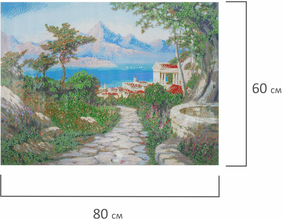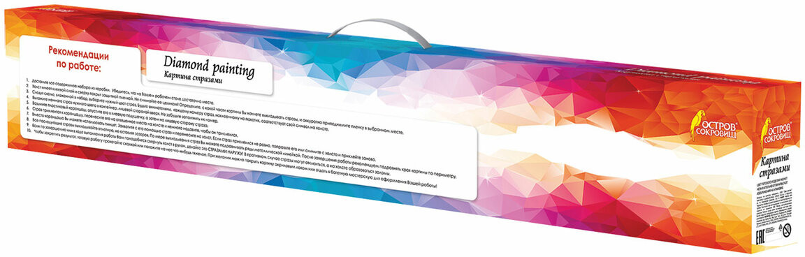 Размер готовой картины составляет 60 × 80 см. Картина полностью заполняется квадратными акриловыми стразами, благодаря чему готовая работа блистает и переливается на свету. Техника алмазной мозаики проста в исполнении и не требует владения никакими специальными навыками. Все необходимые для работы материалы и инструменты входят в набор. С подробной инструкцией можно ознакомиться на упаковке. Товар высокого качества с детально проработанной схемой и надежным клеевым слоем, но при этом относится к среднему ценовому сегменту.