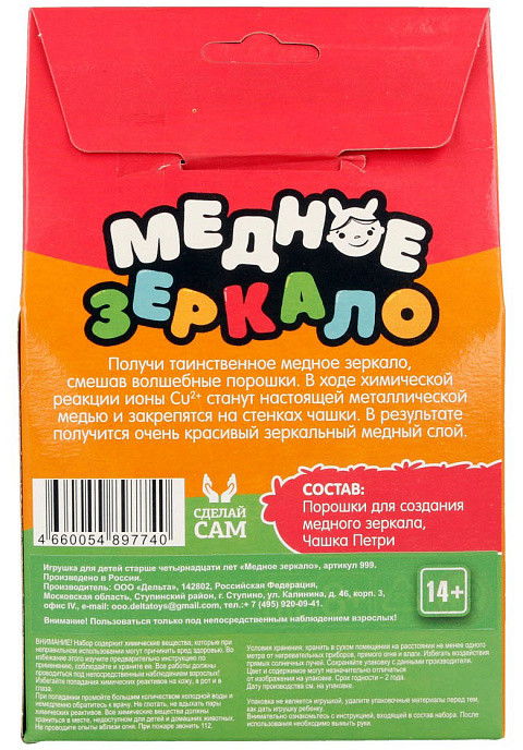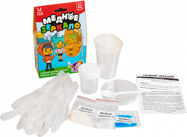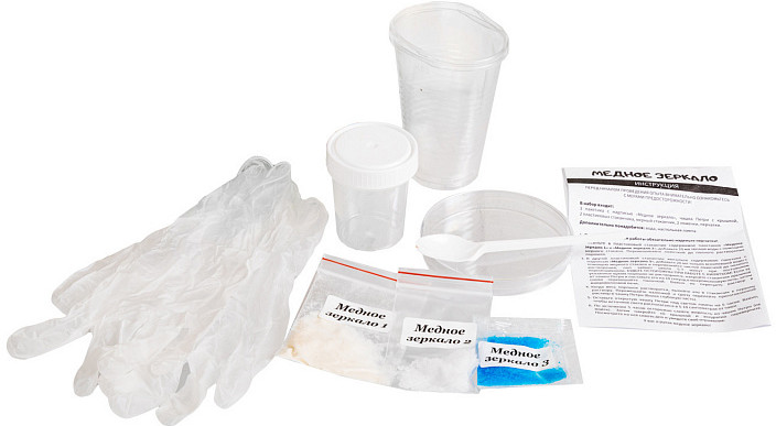 • порошки для создания медного зеркала (3 пакетика: сульфат меди, ацетат натрия, аскорбат натрия);