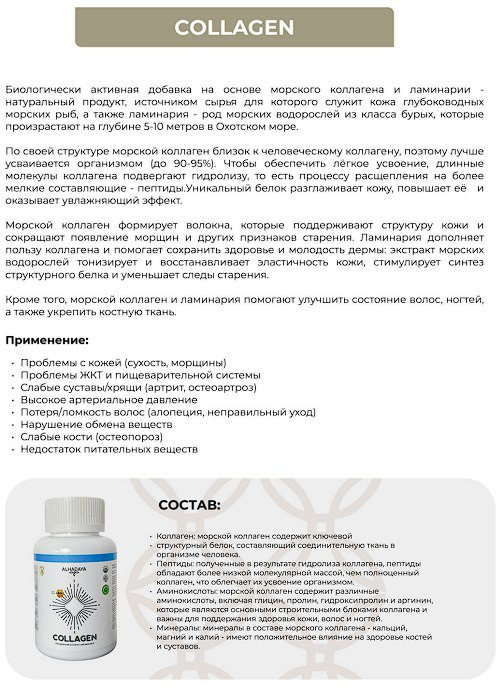 Натуральный коллаген с витамином СВ данный момент этот товар отсутствует в продаже. Возможно, у нас найдется аналогичный или похожий товар здесь. Биологическая активная добавка на основе морского коллагена и ламинарии — натуральный продукт, источником сырья для которого служит кожа глубоководных морских рыб, а также ламинария — род морских водорослей из класса бурых, которые произрастают на глубине 5-10 м в Охотском море. |