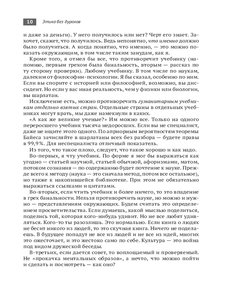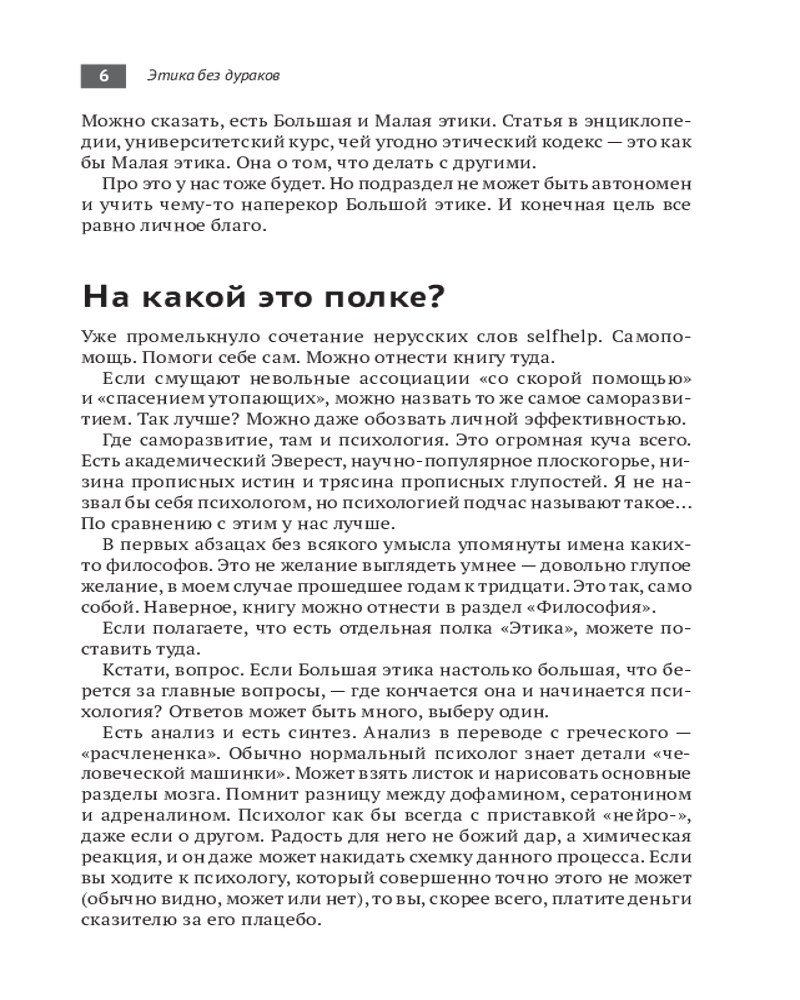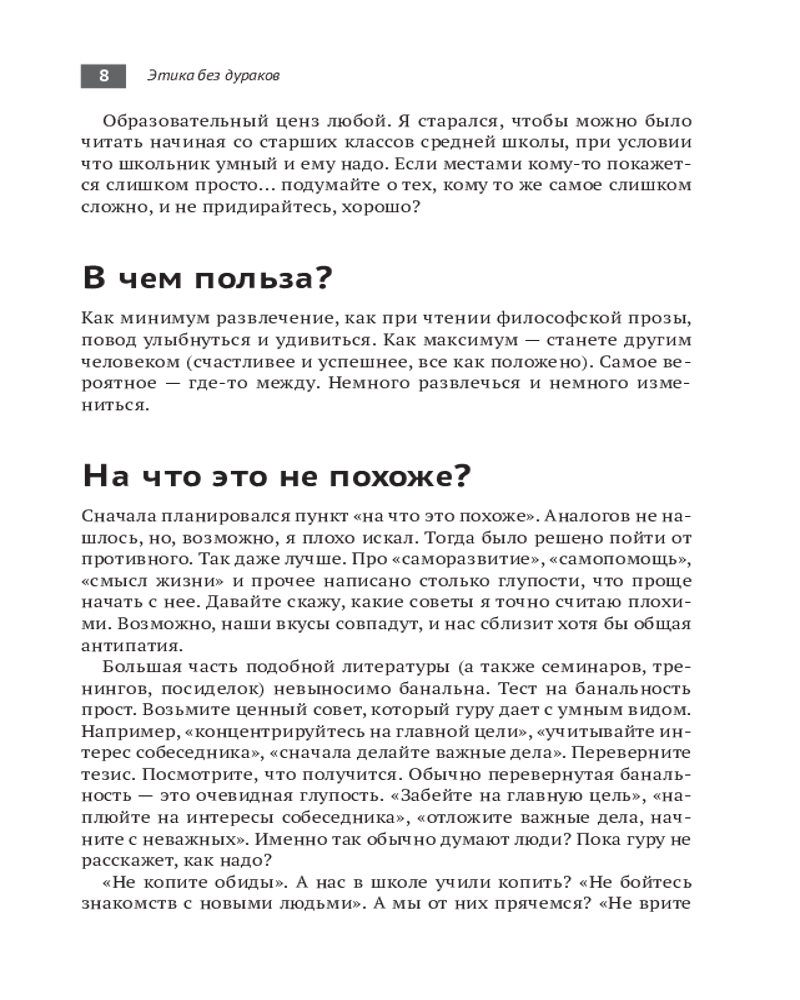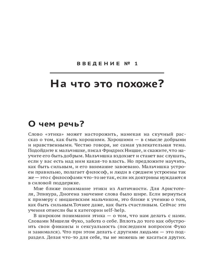 💳 Оплатить за товар можно при получении 🇰🇿 Есть бесплатная доставка по Казахстану 🎁 Копите бонусы с каждой покупки Слово «этика» может насторожить, намекая на скучный рассказ о том, как быть хорошими. Подойдите к мальчишке, писал Фридрих Ницше, и скажите, что научите его быть добрым. Мальчишка вздохнет. Но предложите научить, как быть сильным, и его внимание завоевано. Мне ближе понимание этики из античности. Для Аристотеля, Эпикура, Диогена значение слова было шире. Если вернуться к примеру с ницшевским пацаном, это ближе к учению о том, как быть сильным. Точнее даже, быть счастливым. Сейчас эти учения отнесли бы к категории self-help. Большая часть подобной литературы невыносимо банальна. Возьмите ценный совет, который гуру дает с умным видом. Например, «учитывайте интерес собеседника». Переверните тезис. Обычно перевернутая банальность — это очевидная глупость. «Наплюйте на интересы собеседника». Именно так обычно думают люди? Пока гуру не расскажет, как надо? Так вот: как минимум, перед вами небанальная книга. Как максимум, станете после ее прочтения другим человеком. Но это неточно. |