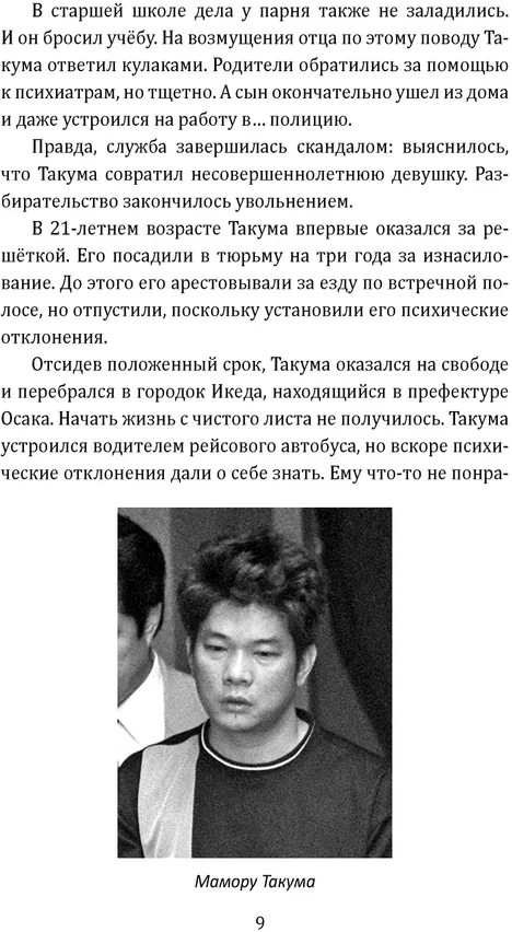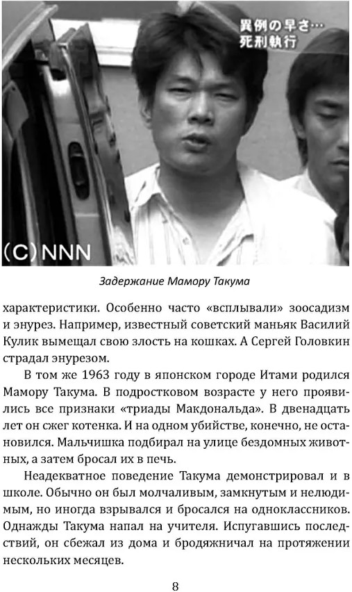 Маньяки Японии. Убийцы страны харакири, самураев и сакеВ данный момент этот товар отсутствует в продаже. Возможно, у нас найдется аналогичный или похожий товар здесь. Серия: Документальный триллер Япония. Загадочная и древняя цивилизация. Глубокая созерцательность здесь сочетается с лихой удалью, тонкая этика — с сексуальной раскрепощённостью, а строгое следование общественным нормам — с индивидуализмом и даже ницшеанством. Естественно, в японском обществе, где человек зажат в рамки патриархальной семьи и корпоративной культуры, возникли сложные общественные проблемы. Эти недуги подчас приобретают самый жуткий и гротескный характер, вырываются на поверхность: выползают из темных подворотен бескрайних токийских трущоб, из заброшенных колодцев, из крохотных замусоренных каморок... Будьте готовы окунуться в настоящую пучину безысходности, тлена, деградации и морального разложения. Здесь погибают все добрые человеческие чувства. Здесь наступает граница между человеком и демоном. Эта книга откроет вам пугающий мир боли и страданий. |