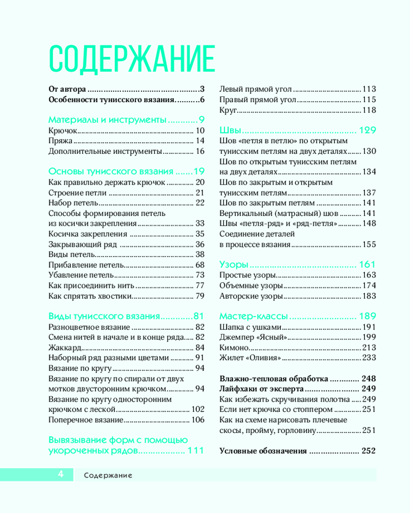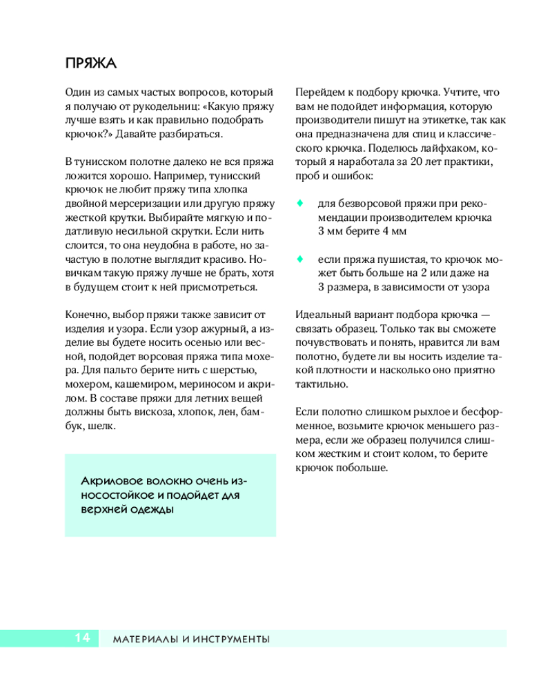 Полная и четко структурированная информация обо всем, что нужно знать и уметь, осваивая тунисское вязание: как выбрать пряжу и крючок, как его правильно использовать, все приемы и техники тунисского вязания, все об узорах всех видов, о вывязывании форм с помощью укороченных рядов, все виды тунисского вязания, круговое, поперечное, разноцветное. А еще — правила влажно-тепловой обработки и ухода за готовыми вещами.