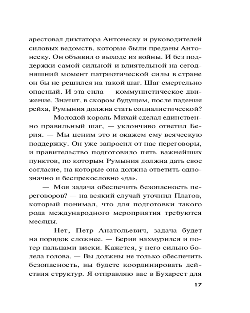 1944 год. В Румынии к власти приходит король Михай Первый. Он разрывает отношения с Гитлером и берет курс на сближение с Советским Союзом. В Бухаресте планируется встреча глав государств антигитлеровской коалиции. Однако фашистские недобитки пытаются сорвать это мероприятие. Будучи хорошо осведомлены о деталях предстоящей встречи, бандиты обстреливают самолет, в котором летят представители советской делегации. Для обеспечения безопасности в Румынию в числе других направляется группа спецназа Максима Шелестова. Помимо прочего, бойцам дано особое задание: выявить и обезвредить засевшего в наших рядах предателя... |