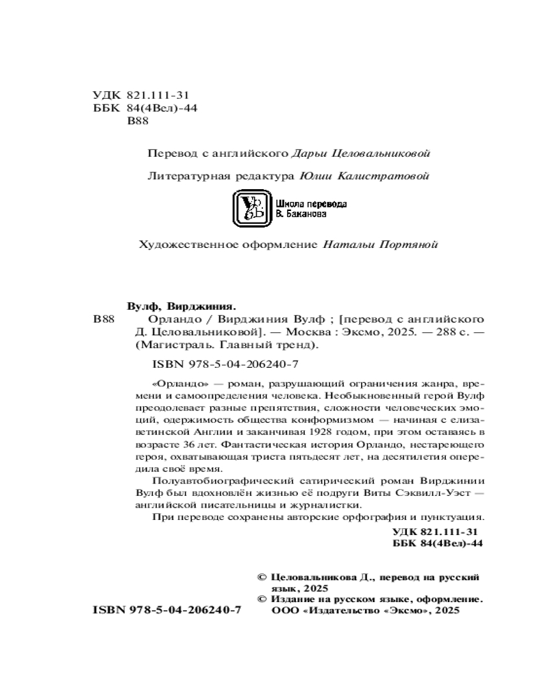 💳 Оплатить за товар можно при получении 🇰🇿 Есть бесплатная доставка по Казахстану от 1 дня 🎁 Копите бонусы с каждой покупки Серия: Магистраль. Главный тренд «Орландо» — роман, разрушающий ограничения жанра, времени и самоопределения человека. Необыкновенный герой Вулф преодолевает разные препятствия, сложности человеческих эмоций, одержимость общества конформизмом — начиная с елизаветинской Англии и заканчивая в 1928 году, при этом оставаясь в возрасте 36 лет. Фантастическая история Орландо, нестареющего героя, охватывающая триста пятьдесят лет, на десятилетия опередила своё время. |