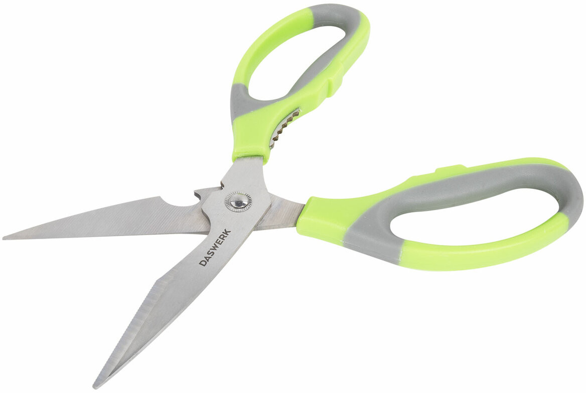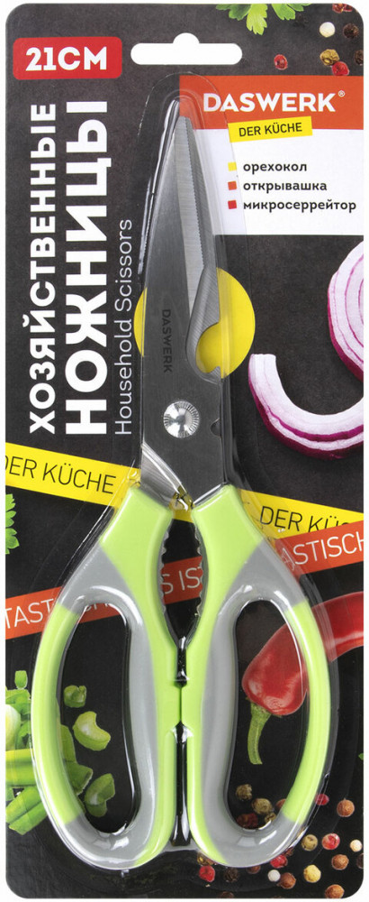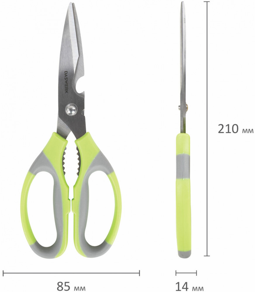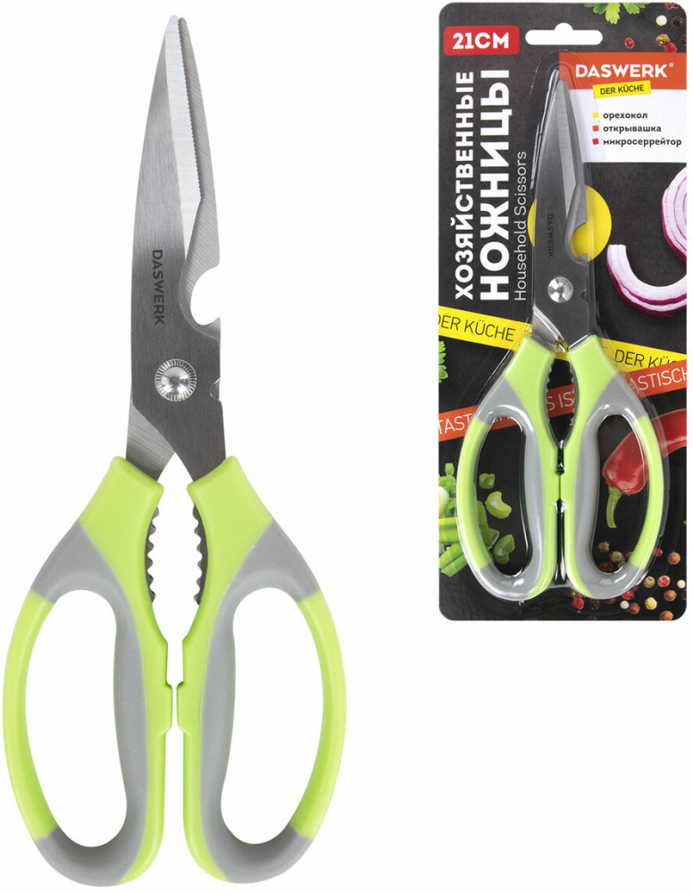 Daswerk Ножницы кухонныеВ данный момент этот товар отсутствует в продаже. Возможно, у нас найдется аналогичный или похожий товар здесь. Кухонные ножницы Daswerk сочетают в себе максимальную функциональность и прочность. Конструкция модели позволяет справиться с различными задачами на кухне и в быту. Прочные лезвия толщиной 2.5 мм из нержавеющей пищевой стали, соединены усиленной осью, что исключает зазор и люфт, обеспечивая точность реза. Изделие снабжено эргономичными пластиковыми ручками с противоскользящими вставками, обеспечивающими надежный захват инструмента при работе и препятствующими выскальзыванию его из рук. Легко моется, не впитывает посторонние запахи, можно мыть в посудомоечной машине. Общая длина — 210 мм. Оснащены открывашкой для бутылок, механизмом для колки орехов и серрейторной заточкой для резки ткани и веревок. Ножницы отлично подойдут для разделки рыбы и мяса птицы, нарезки овощей, зелени и пиццы. Будут эффективны при резке бумаги, картона, текстильных материалов, а также справятся с подрезкой комнатных и садовых растений. |