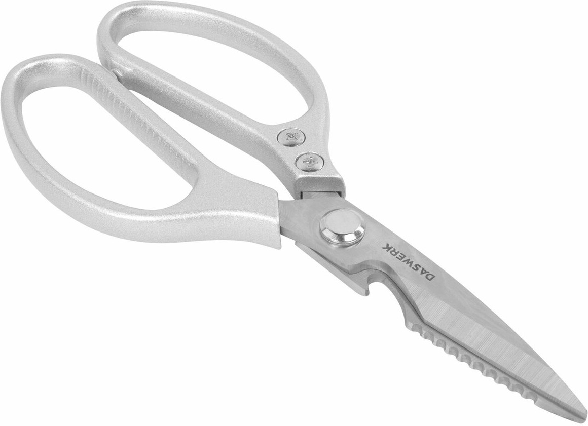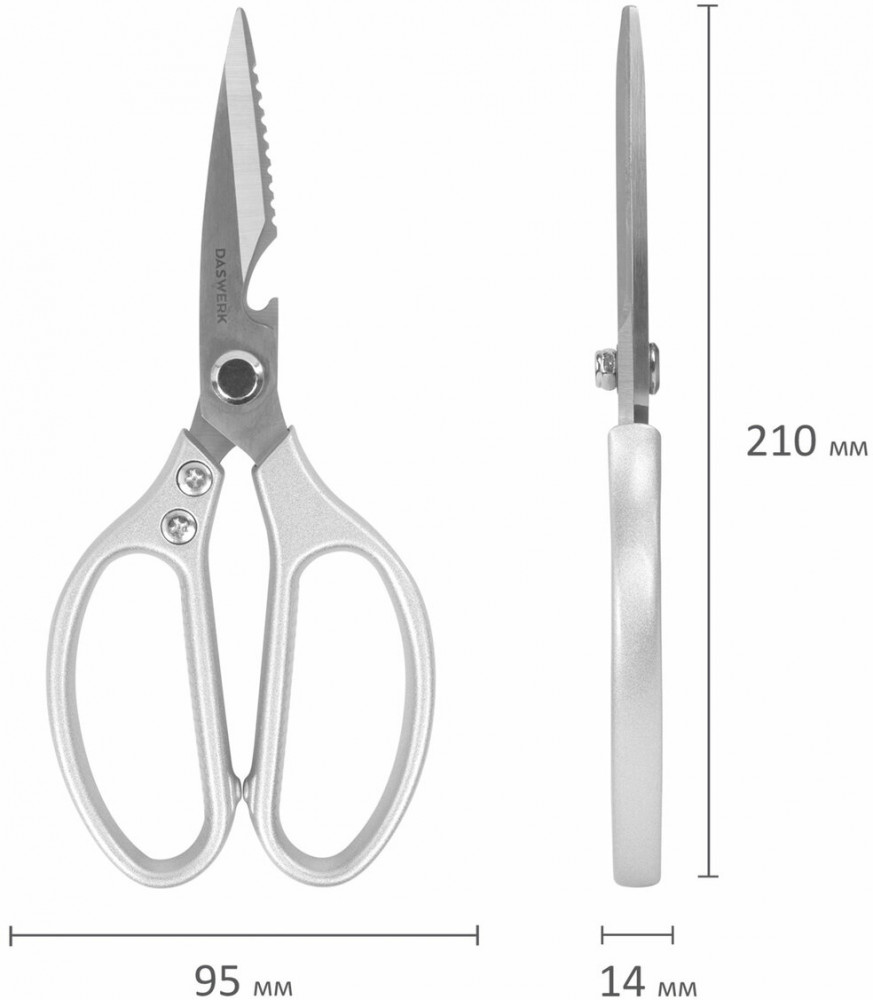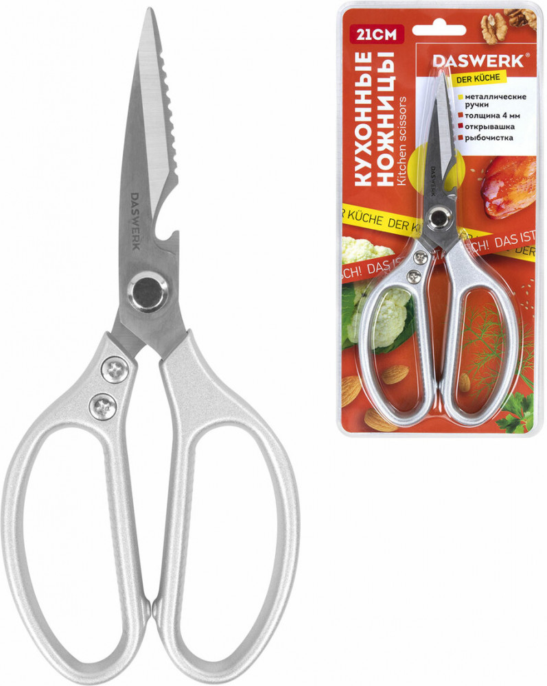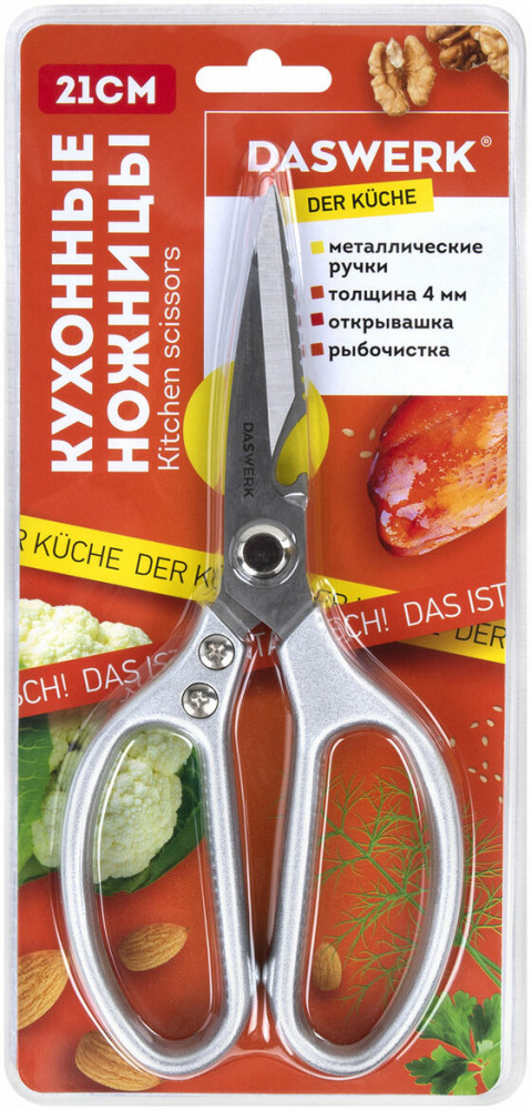 Кухонные ножницы Daswerk сочетают в себе максимальную функциональность и прочность. Конструкция модели позволяет справиться с различными задачами на кухне и в быту. Прочные лезвия толщиной 4 мм из нержавеющей пищевой стали, соединены усиленной осью, что исключает зазор и люфт, обеспечивая точность реза. Изделие снабжено эргономичными металлическими ручками с противоскользящим покрытием, обеспечивающими надежный захват инструмента при работе и препятствующими выскальзыванию его из рук. Легко моется, не впитывает посторонние запахи, можно мыть в посудомоечной машине. Общая длина — 210 мм. Ножницы оснащены открывашкой для бутылок и зазубренным ребром для чистки рыбы. Ножницы отлично подойдут для разделки рыбы и мяса птицы, нарезки овощей, зелени и пиццы. Будут эффективны при резке бумаги, картона, текстильных материалов, а также справятся с подрезкой комнатных и садовых растений. |