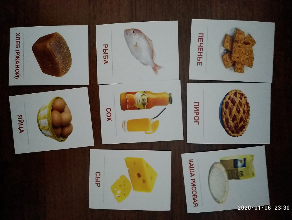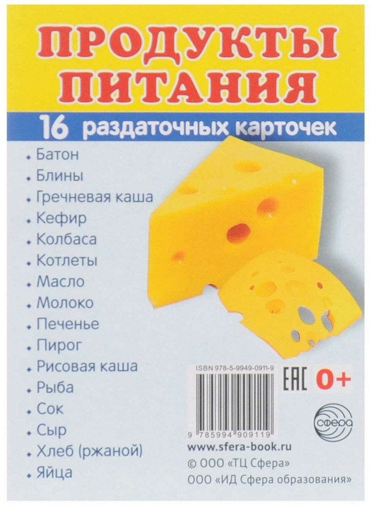 Продукты питания. 16 раздаточных карточек с текстом+24 яркие картинки плотный картон двуязычные надписи маленький размер