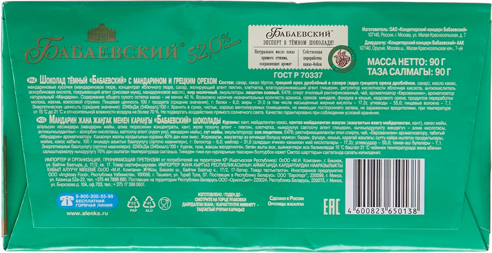 Бабаевский кондитерский концерн Шоколад тёмный «Мандарин и грецкий орех»
