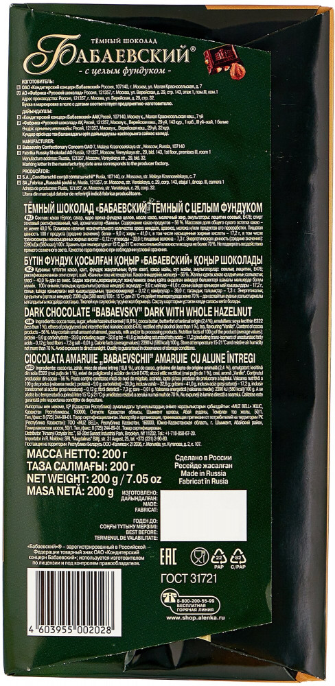Бабаевский кондитерский концерн Шоколад тёмный с фундуком