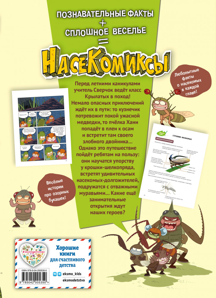 💳 Оплатить за товар можно при получении 🇰🇿 Есть бесплатная доставка по Казахстану от 1 дня 🎁 Копите бонусы с каждой покупки Серия: НасеКомиксы Долгожданное продолжение серии познавательных комиксов о насекомых! Герои комикса — совсем как настоящие дети: ходят в школу, дружат, попадают в переделки, но... все они — насекомые! Скорее открывай книгу про насекомых и узнай, как озорные ученики класса Крылатых отправились в большой поход! Им предстоит опасное, но увлекательное путешествие. Ребята спасут учителя от хищных ос, раскроют секрет своего одноклассника-кузнечика, встретятся с удивительными насекомыми-долгожителями, подружатся с двойником пчёлки Хани, отважными муравьями и даже бабочкой благородного происхождения... |