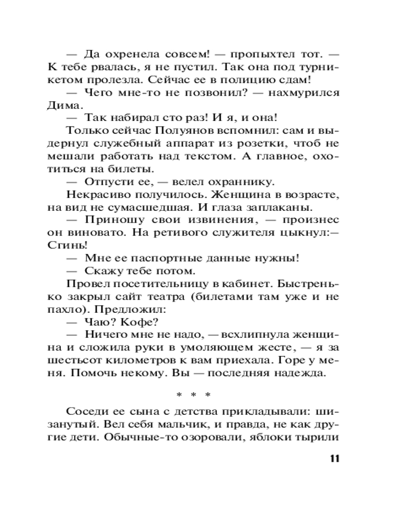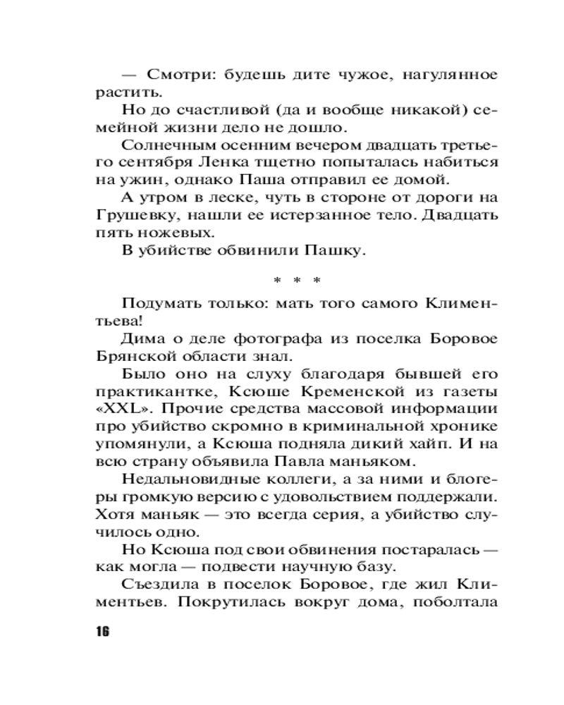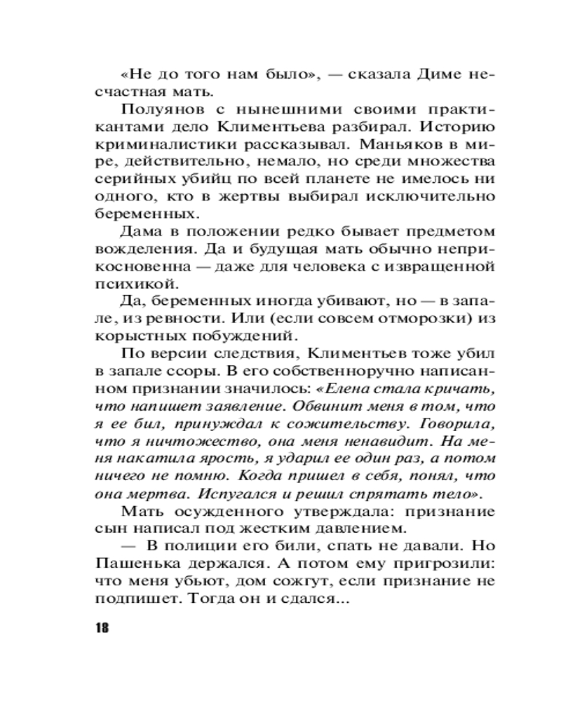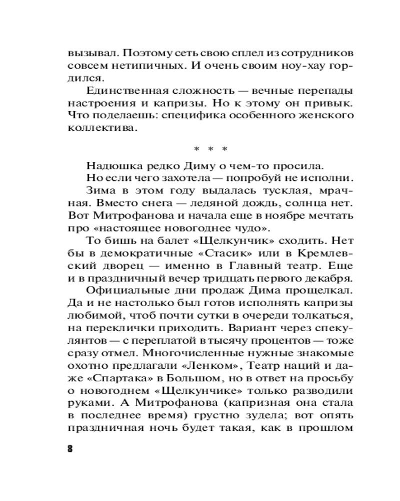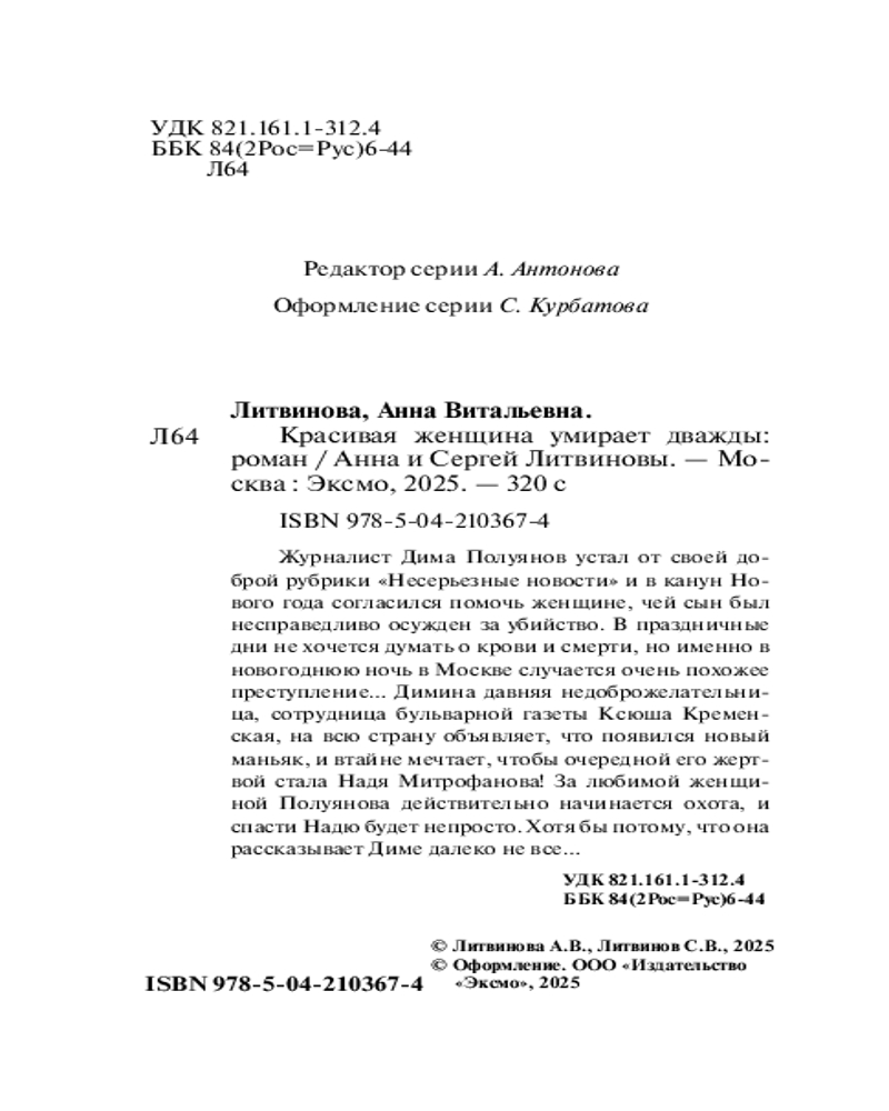 💳 Оплатить за товар можно при получении 🇰🇿 Есть бесплатная доставка по Казахстану от 1 дня 🎁 Копите бонусы с каждой покупки Серия: Знаменитый тандем российского детектива. Новые страницы (обложка) Журналист Дима Полуянов устал от своей доброй рубрики «Несерьезные новости» и в канун Нового года согласился помочь женщине, чей сын был несправедливо осужден за убийство. В праздничные дни не хочется думать о крови и смерти, но именно в новогоднюю ночь в Москве случается очень похожее преступление... Димина давняя недоброжелательница, сотрудница бульварной газеты Ксюша Кременская, на всю страну объявляет, что появился новый маньяк, и втайне мечтает, чтобы очередной его жертвой стала Надя Митрофанова! За любимой женщиной Полуянова, действительно, начинается охота, и спасти Надю будет непросто. Хотя бы потому, что она рассказывает Диме далеко не все... |