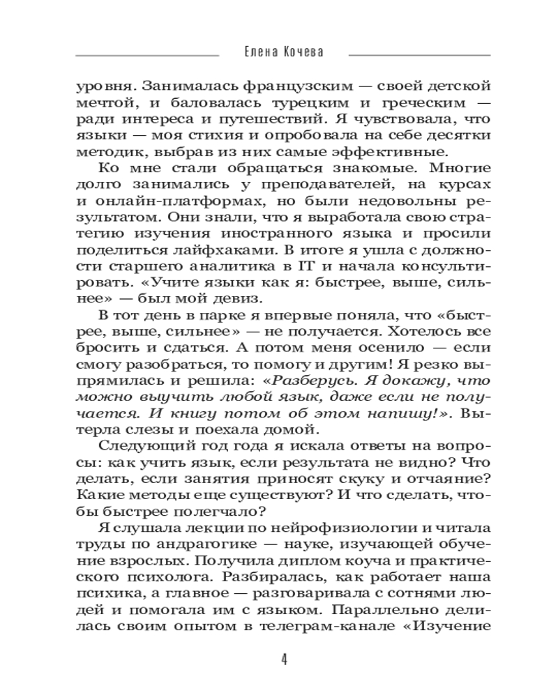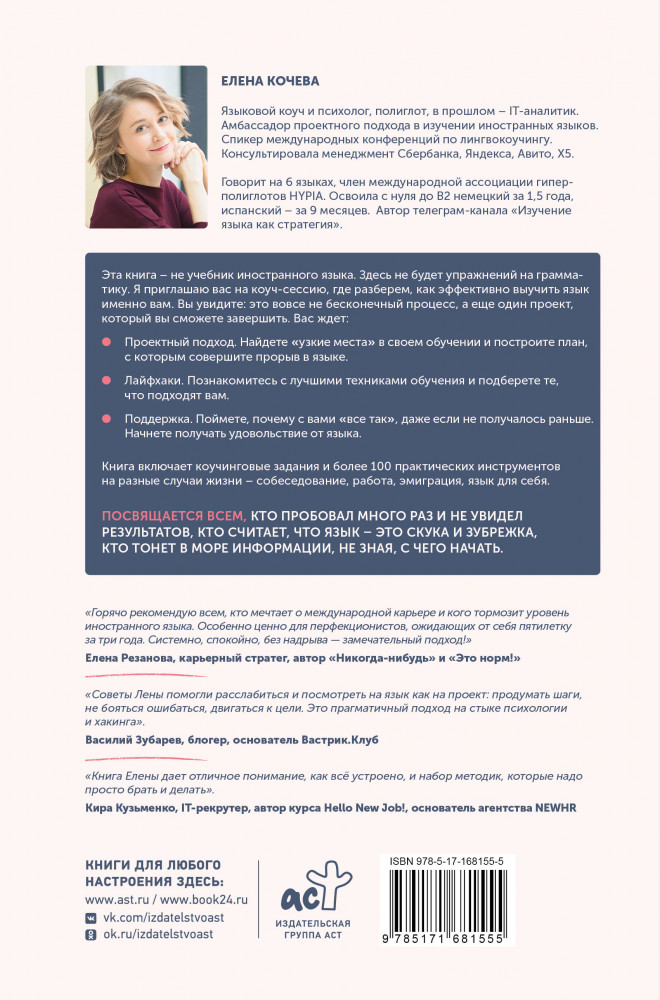 💳 Оплатить за товар можно при получении 🇰🇿 Есть бесплатная доставка по Казахстану от 1 дня 🎁 Копите бонусы с каждой покупки Серия: Лидер Рунета Эта книга — не учебник иностранного языка. Здесь не будет упражнений на грамматику. Автор приглашает вас на коуч-сессию, где вы разберете, как эффективно учить язык именно вам. Елена Кочева — языковой коуч и психолог, полиглот, в прошлом — IT-аналитик. Спикер международных конференций по лингвокоучингу. Консультировала менеджмент Сбербанка, Яндекса, Spotify, Х5. Книга включает коучинговые задания и более 100 практических инструментов на разные случаи жизни — собеседование, работа, эмиграция, язык для себя. |
